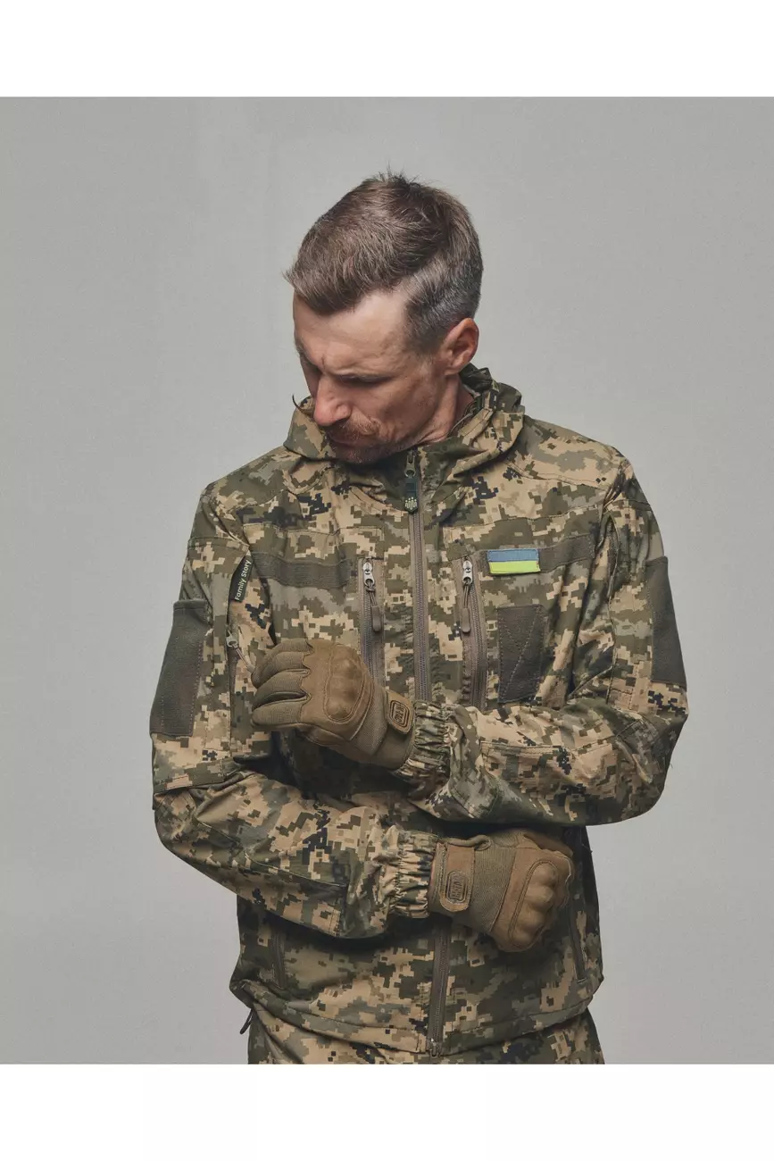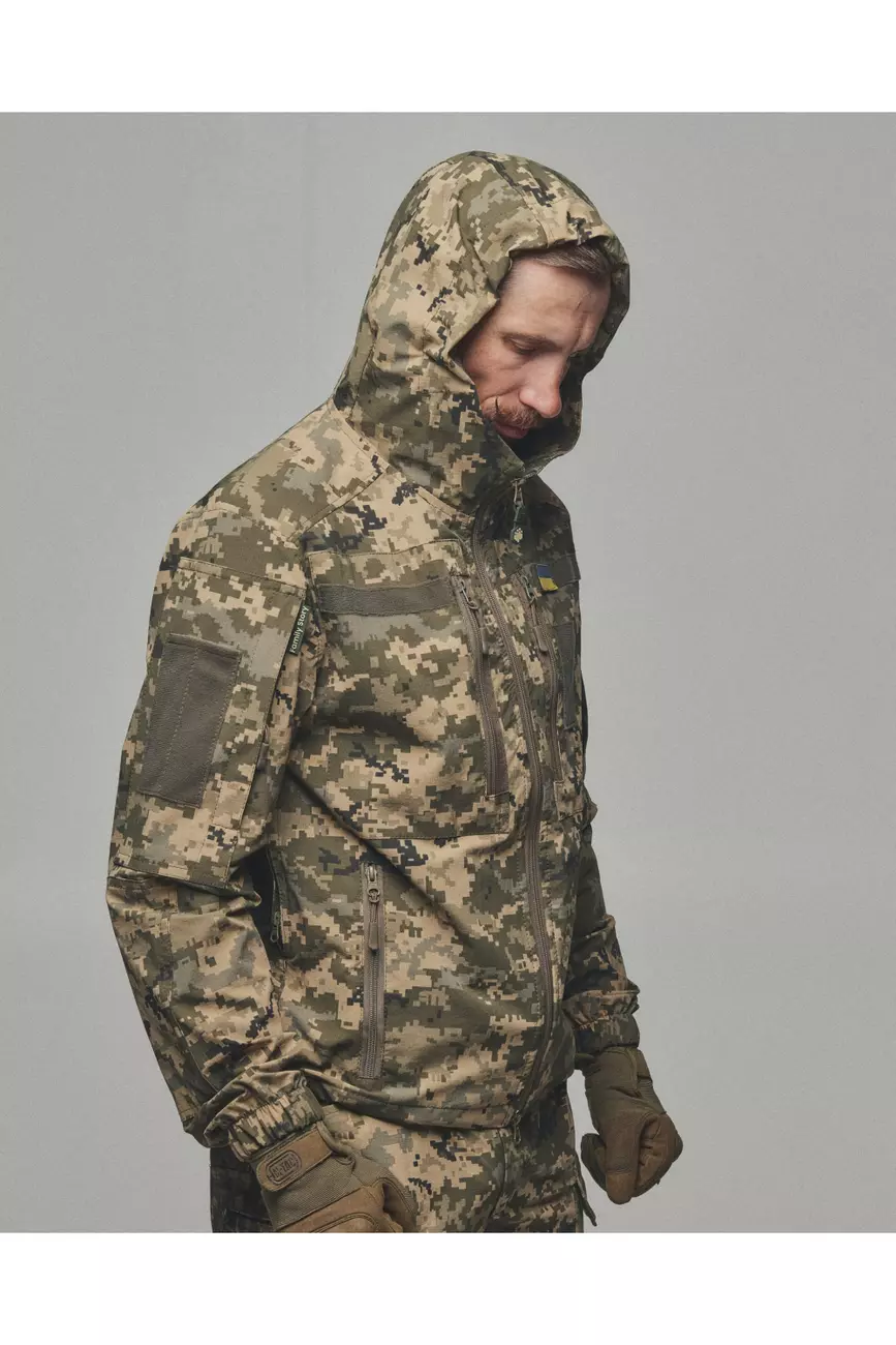 Куртка яка розтягується та не сковує рухи, не пропускає вологу та одночасно дихає. Куртка має 6 кишень, капюшон, шеврони, на манжеті гумка для щільного прилягання та провітрювані кишені з сіткою під пахвами якщо треба знизити температуру після навантаження. Якісна фурнітура та тканина рівня ТОП робить цей виріб унікальним при використані та майже не має аналогів!