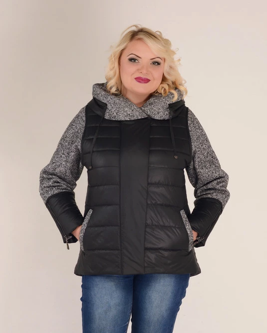 Короткая демисезонная куртка со съемным капюшоном, без ворота. Материал изделия - плащевка (лаке), на тонком синтепоне. По бокам и на плечах мелкая стежка. Крой приталенный, два прорезных кармана на молниях. Застежка - молния, по над застежкой рюша из материала изделия. Куртка с капюшоном может носиться с джинсами, брюками и лоферами или слипонами, без него с платьем или юбокой, застежка капюшона потайная и куртка смотрится элегантно. Длина изделия 65 см, размерный ряд 50-62.