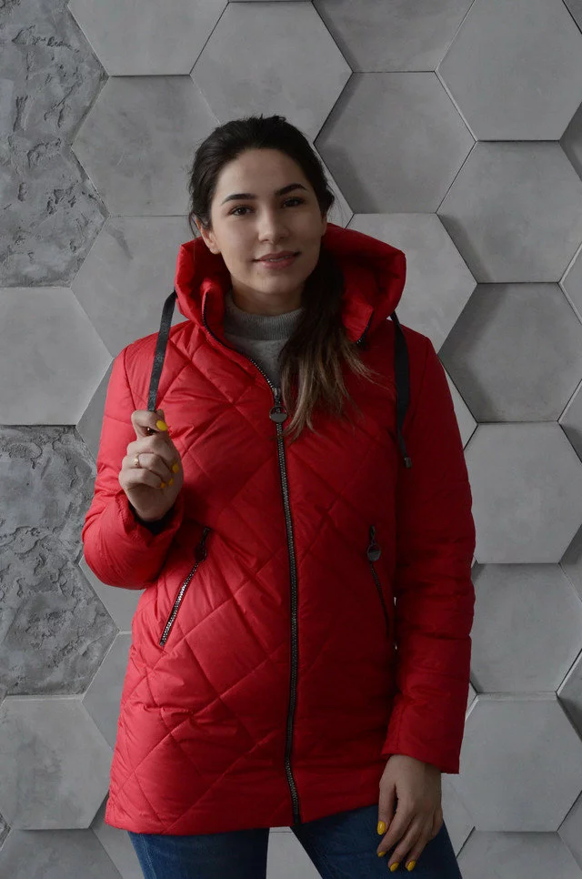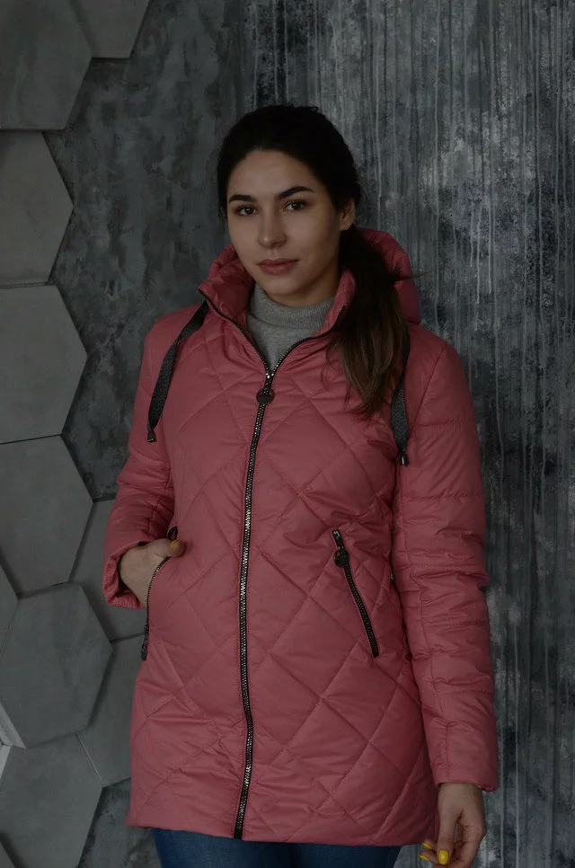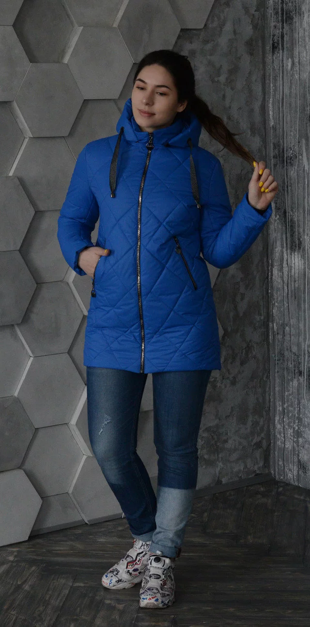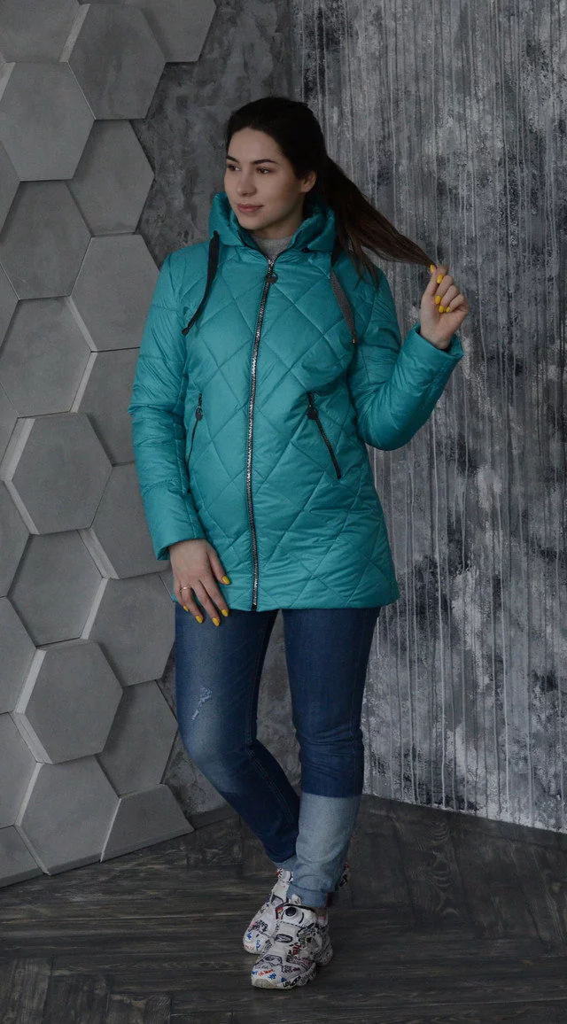 Куртка женская демисезонная удлиненная.Оригинальный полуприталенный силуэт подчеркнет достоинства фигуры.Молния серебристого цвета по центру и на карманах придают изделию изысканный вид.Съемный капюшон удобен и практичен.По спинке низ плавно идет на удлиннение. Используется ткань мемори-лаке.