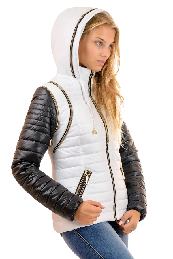 Куртка-трансформер.Ткань - плащевка, утеплитель - синтепон( плотность 120), подкладка - нейлон. Комбинированная двух-цветная куртка с отстегивающимися рукавами, что дает возможность ее носить и как куртку, и как жилетку. Карманы, плечи и капюшон украшены золотыми змейками. Капюшон - отстежной. Представлена в разных расцветках. Размерный ряд 44-50. Длина изделия 63-65см