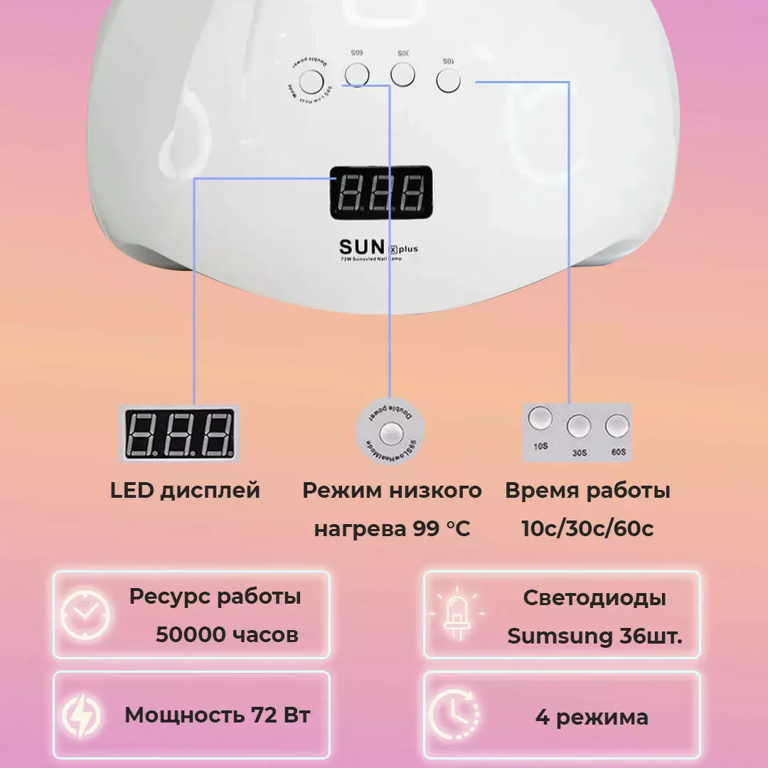 Лампа для маникюра SUN X PLUS 72Вт лампа для ногтей маникюрная на 2 руки для педикюра Led/Uv сушилка для лака