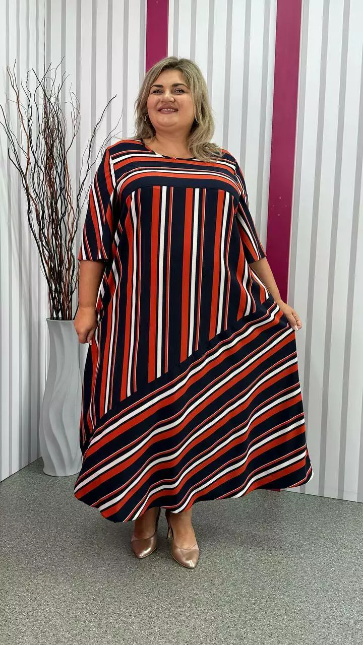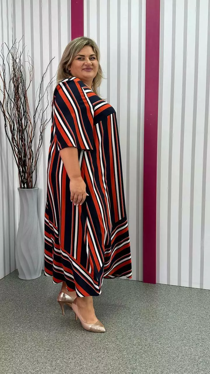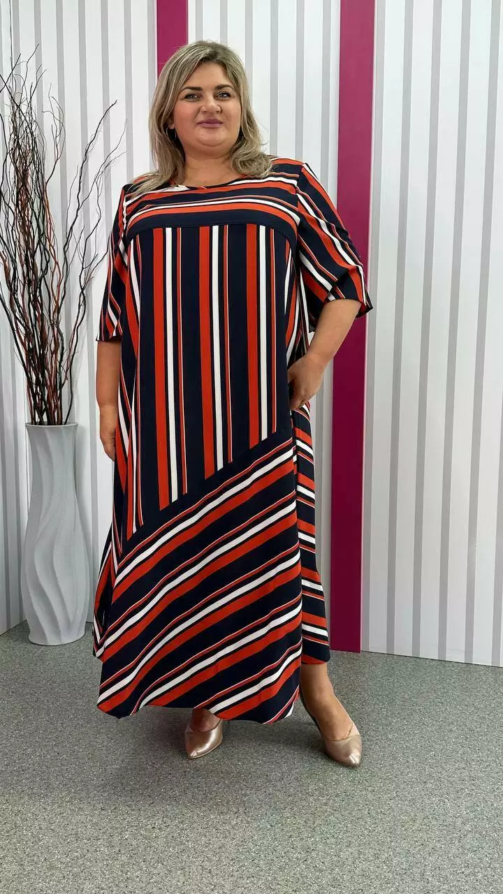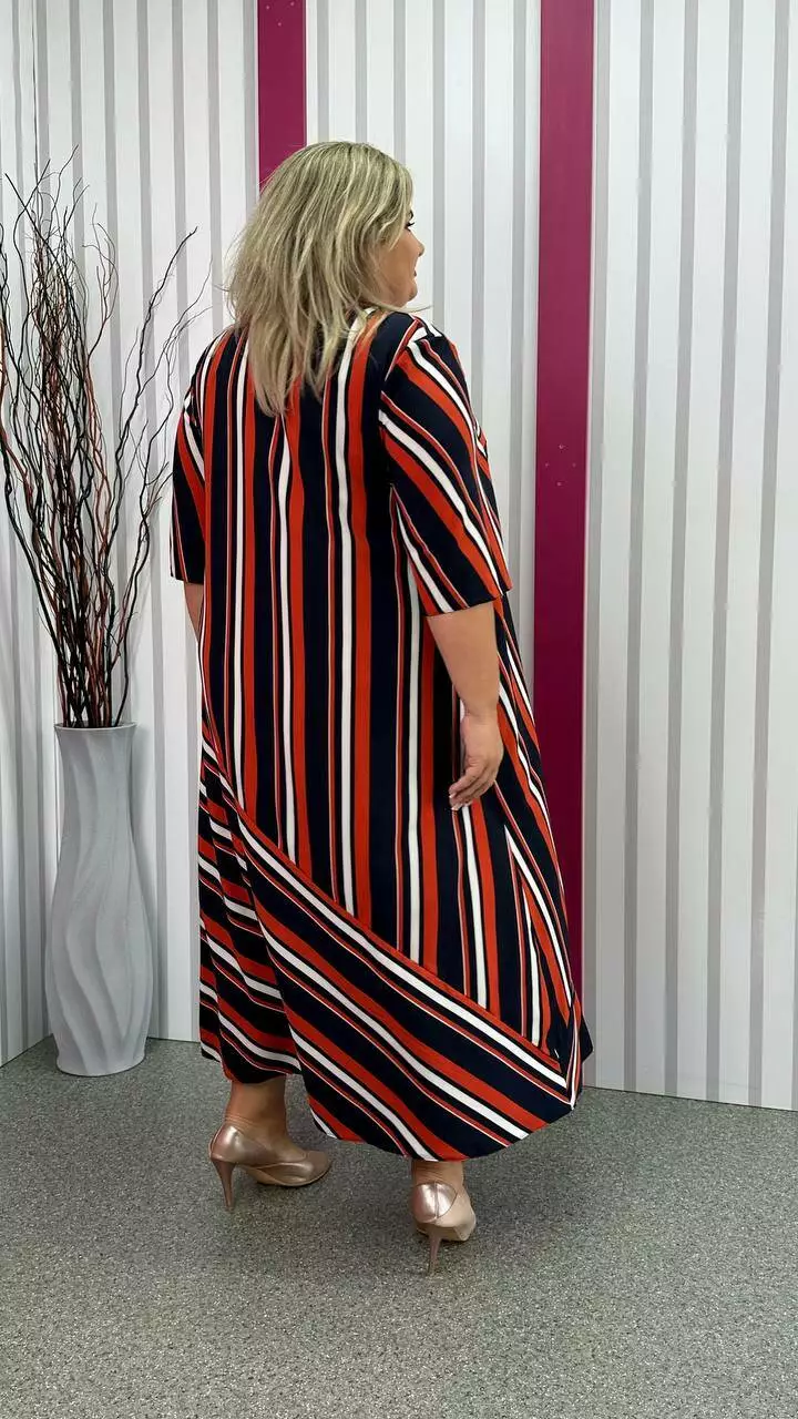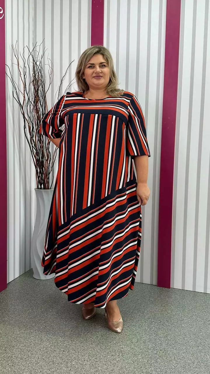 Легка, вільна сукня з турецького супер-софту з невеликою розтяжністю, дуже м'яка і приємна до тіла, не ширяє, не мнеться, не вимагає особливого догляду. А-подібний силует, рукав втачний. Поліестер забезпечує міцність, зносостійкість і незмінність тканини, лайкра для підвищення еластичності тканини, що робить її більш комфортною в шкарпетки і дозволяє краще облягати фігуру. Гра смужки по тканині надає сукні незвичайного та презентабельного вигляду