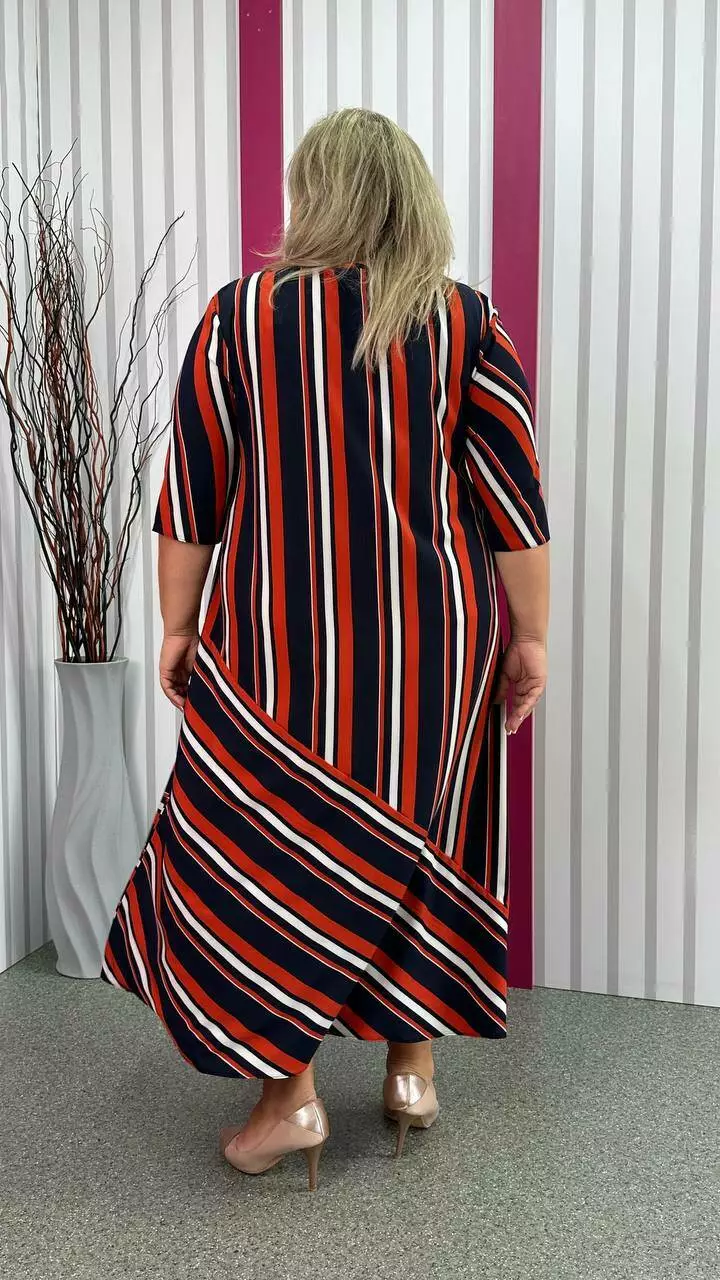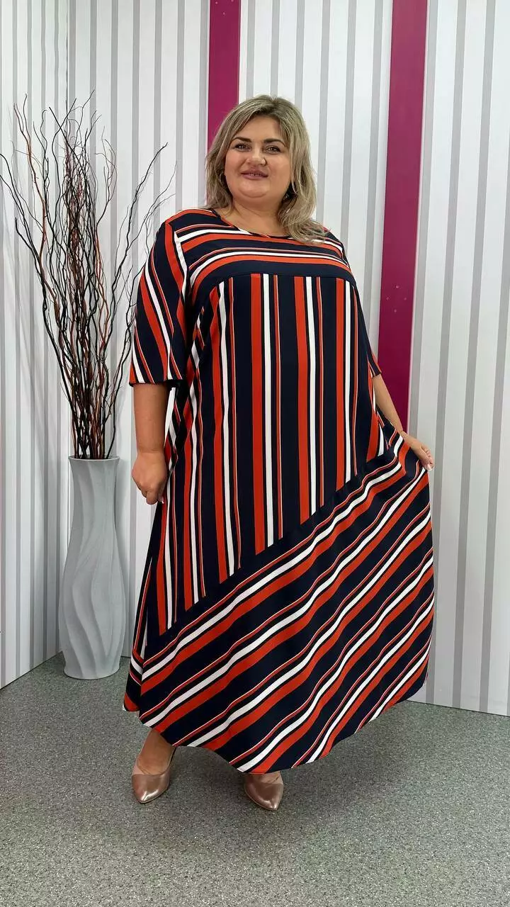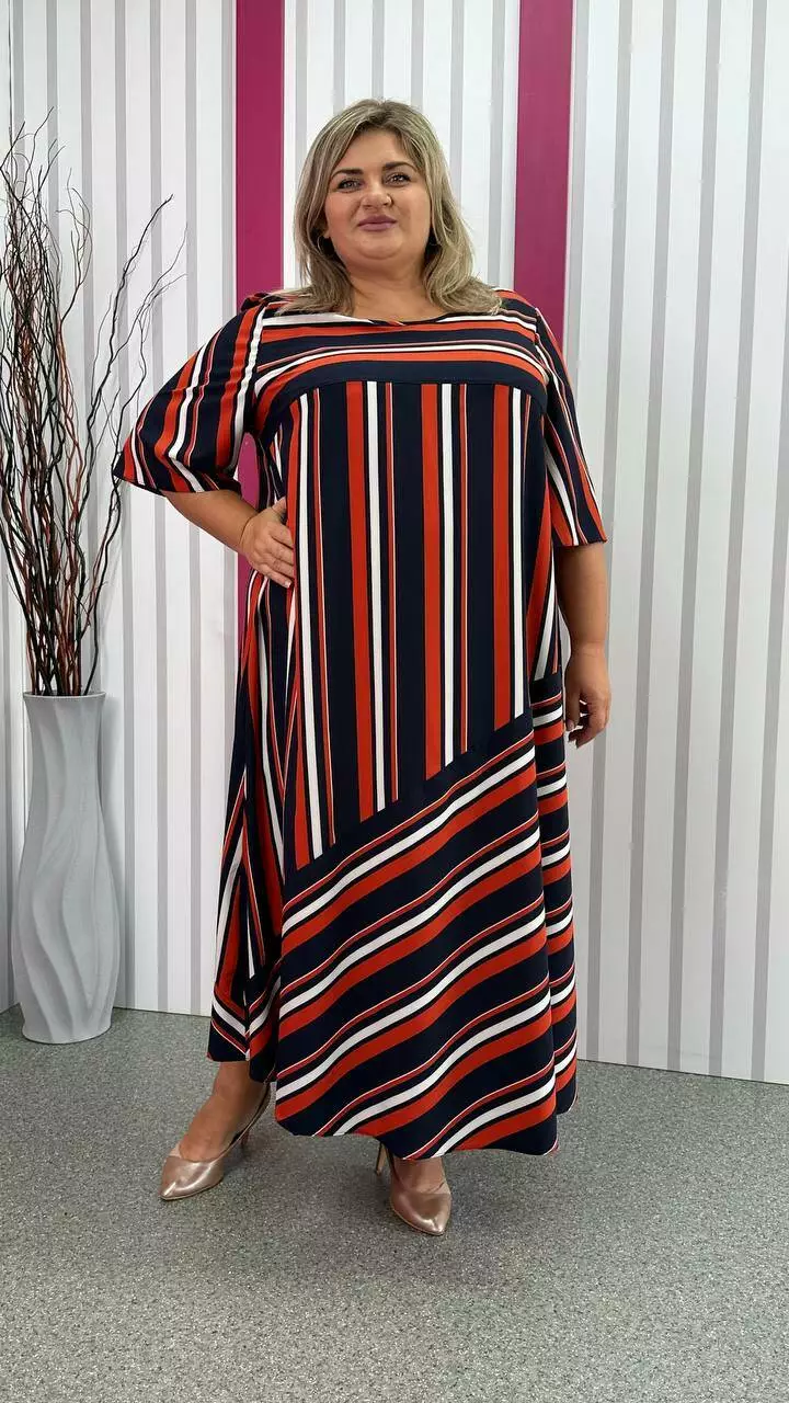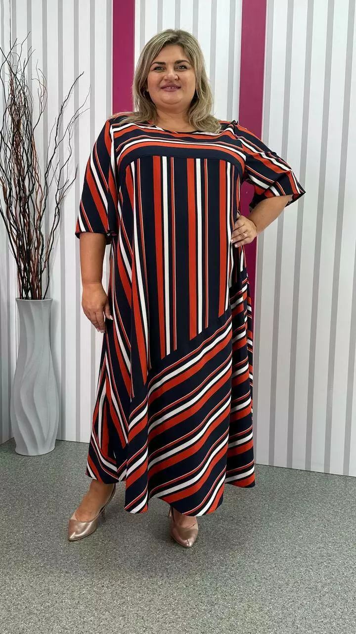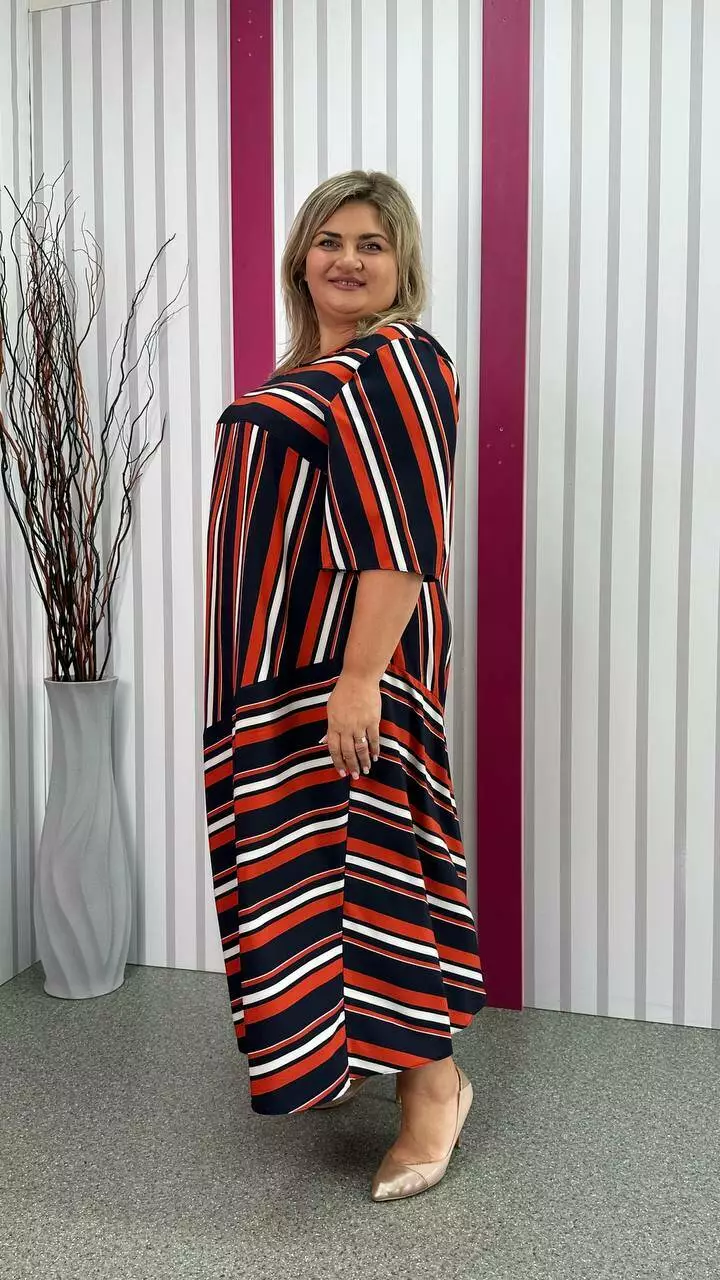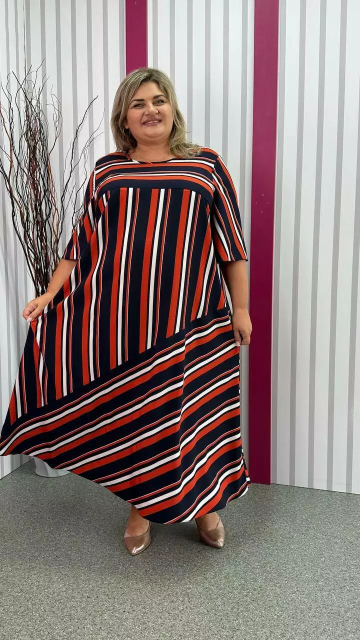 Легка, вільна сукня з турецького супер-софту з невеликою розтяжністю, дуже м'яка і приємна до тіла, не ширяє, не мнеться, не вимагає особливого догляду. А-подібний силует, рукав втачний. Поліестер забезпечує міцність, зносостійкість і незмінність тканини, лайкра для підвищення еластичності тканини, що робить її більш комфортною в шкарпетки і дозволяє краще облягати фігуру. Гра смужки по тканині надає сукні незвичайного та презентабельного вигляду