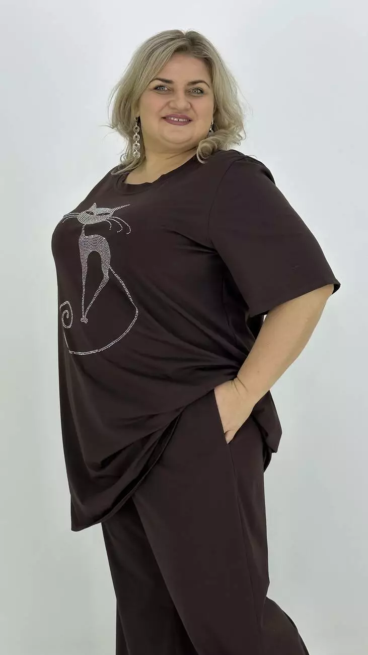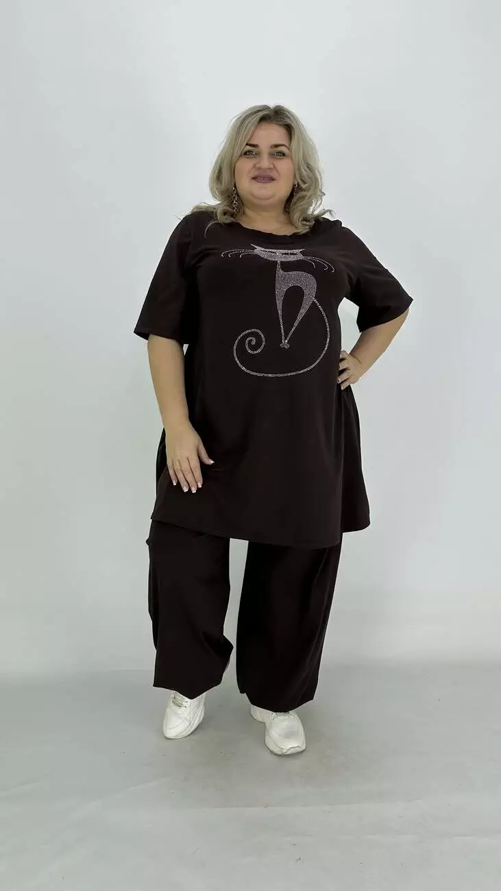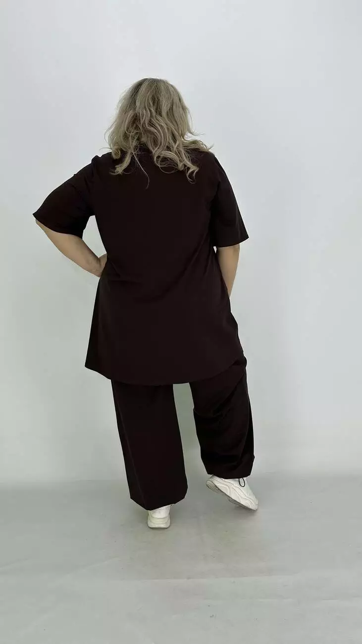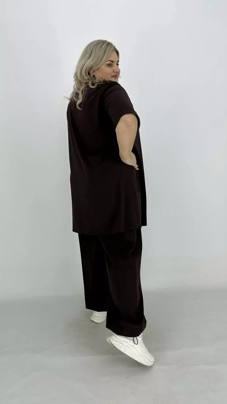 Легкий костюм з куліра, люкс якості п/в Туреччина. Тканина бавовна з еластаном гарної розтяжності, м'яка тонка і дуже приємна до тіла, не кашлатиться, не пом'якшується, не витягується, тримає форму. Футболка подовжена та розкльошена, з якісним кам'яним накатом. Штани широкі, внизу регулюються на гумці, з кишенями, зручна висока посадка.