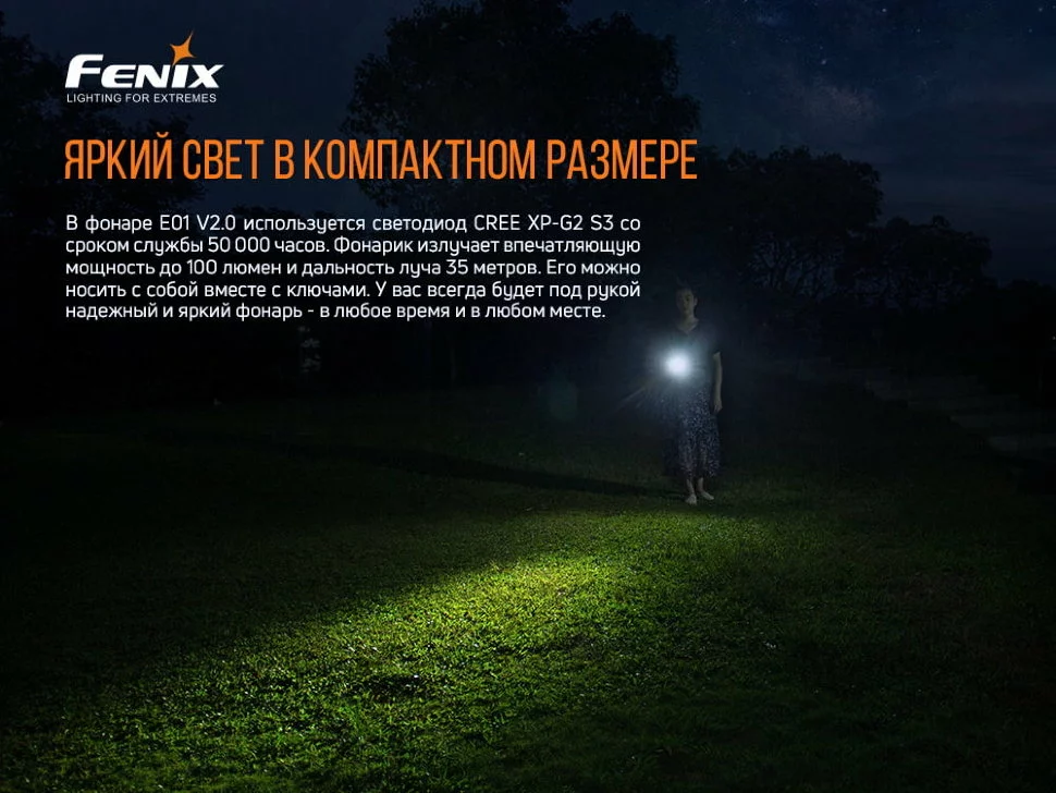 Модель ліхтарі Fenix E01 V2.0 продовжує лінійку EDC-виробів. Це дуже компактний ліхтар, прекрасно адаптований під ваш швидкий ритм життя і нагальні завдання. Його невеликі розміри і простота дозволяють завжди мати під рукою портативний джерело світла. Що добре для різних ситуацій на практиці. У складі моделі – діод популярного виробника Cree. А саме – XP-G2 S3, розрахований на роботу протягом 50 тисяч годин. Якісний світлодіод сприяє надійної і стабільної роботи виробу, даючи промінь з максимальною яскравістю 100 люменів. Цього рівня світла вистачає, щоб підсвічувати найближчі об'єкти перед собою. Або висвітлювати невелике приміщення. Далекобійність досягає 35 метрів.
