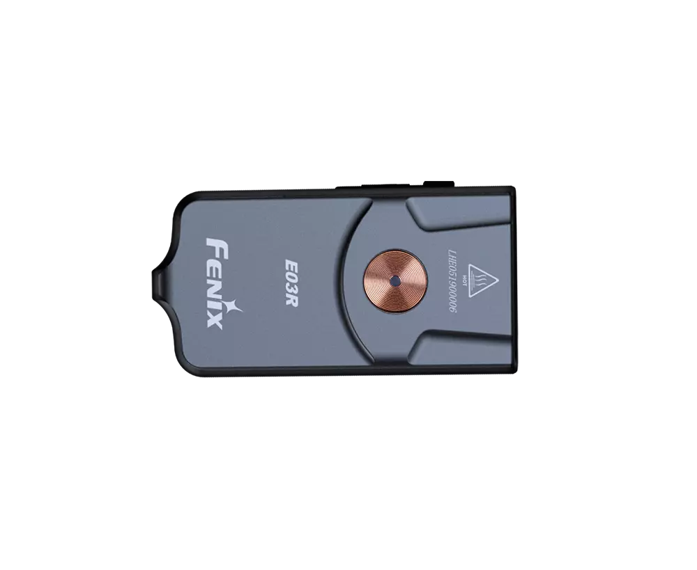 Модель Fenix E03R являє собою маленький брелок для ключів, з повністю металевим корпусом. При виготовленні вироби використовували високоточну машинну обробку. Ліхтар має вбудований літій-полімерним акумулятором на 200 міліампер-годин. Є функція індикації ступеня зарядженості, а також опція попередження про низьку напругу. Виріб забезпечено поглибленої кнопкою з можливістю блокування.