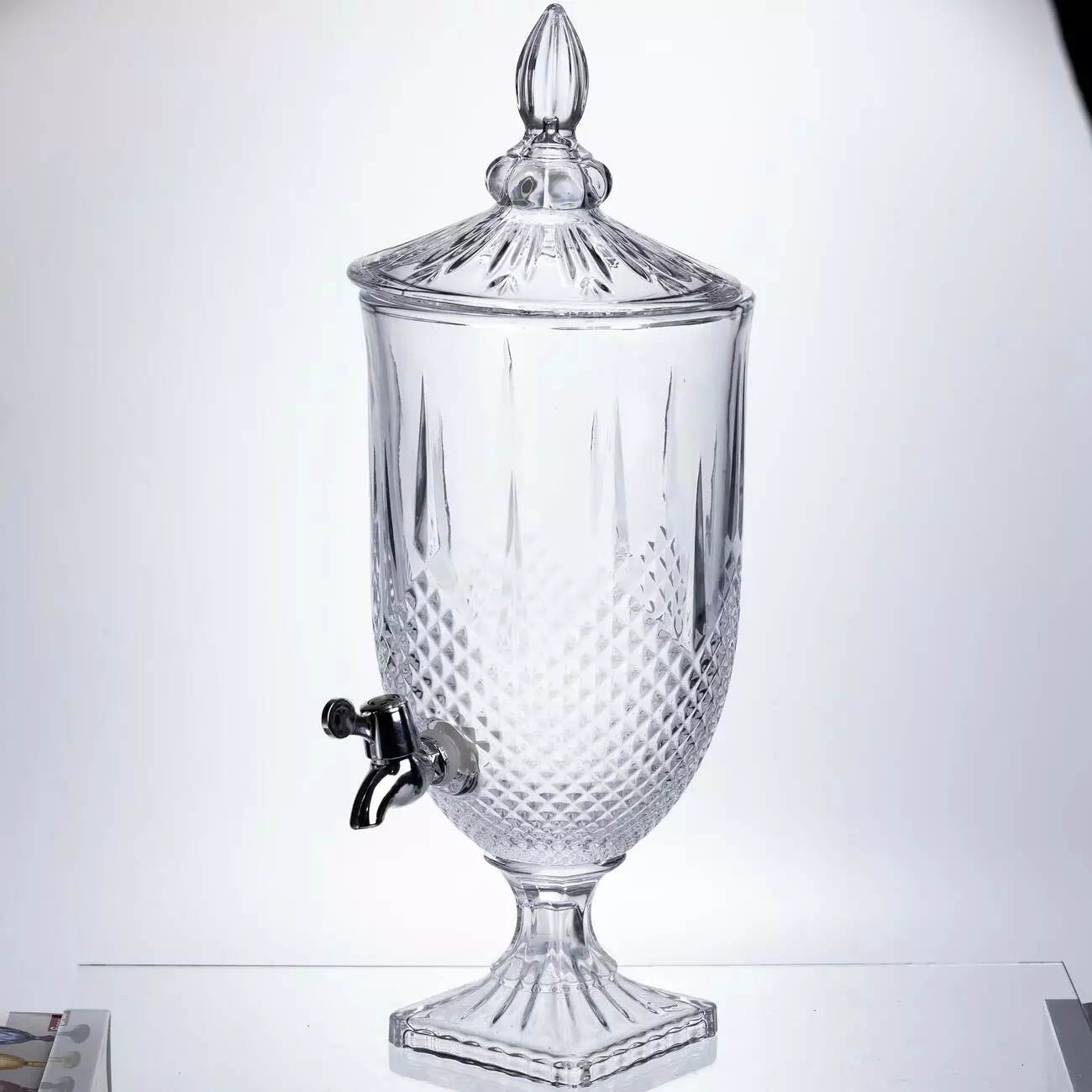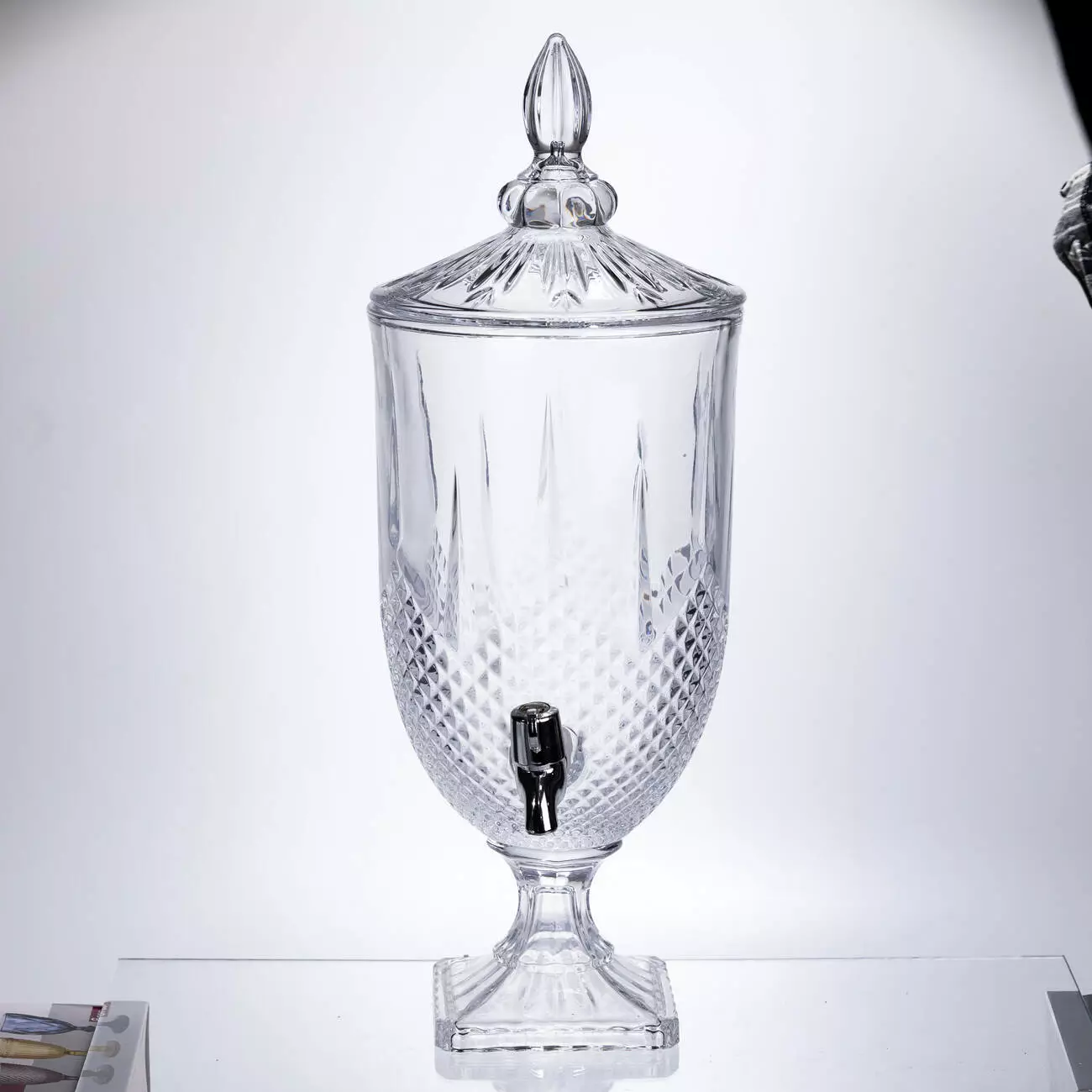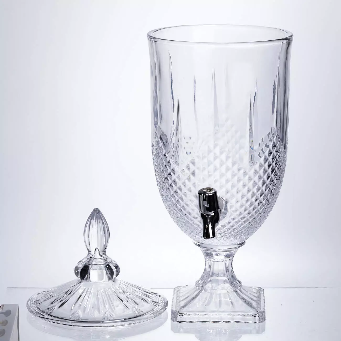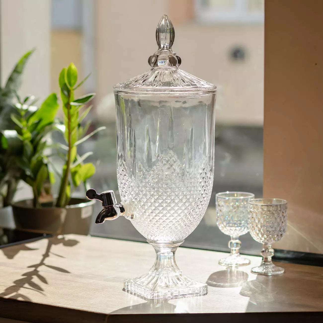 Елегантна скляна лимонадниця об'ємом 5 літрів з кришкою та краном ідеальна для подачі лимонаду, морсів, компотів та коктейлів на вечірках та застіллях. Підходить для домашніх та виїзних свят, кафе, кав'ярень та кейтерингу.