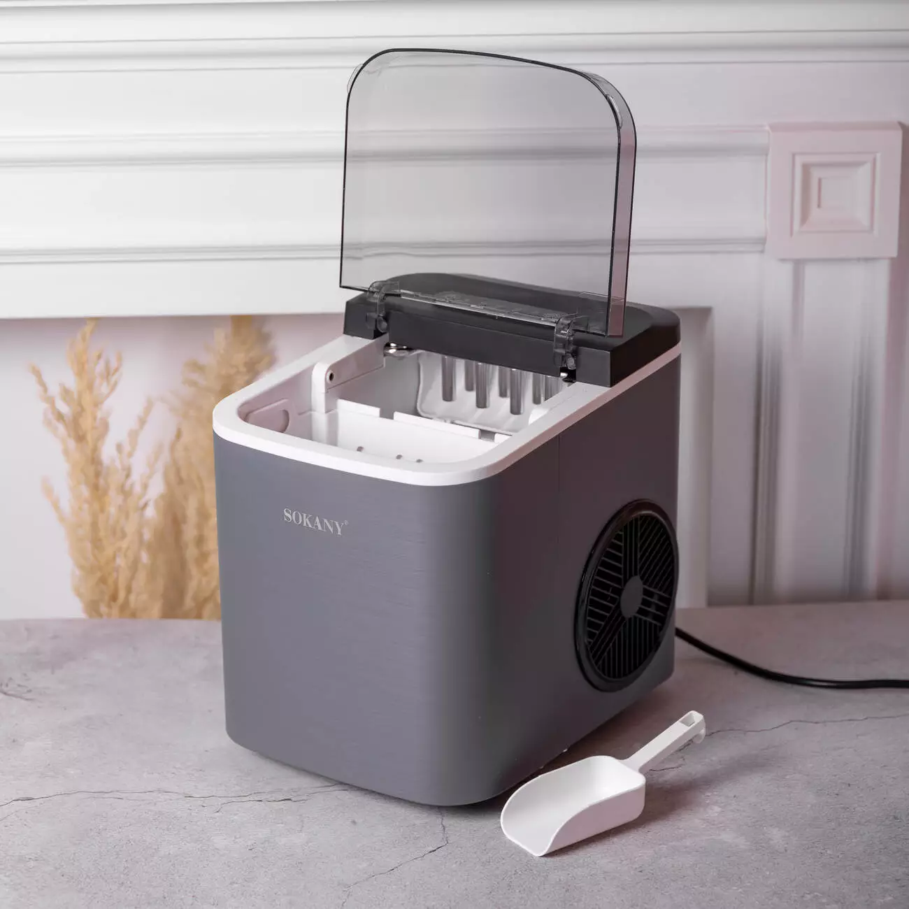 SOKANY SK-03038 - настільний льодогенератор, який забезпечує до 12 кг свіжого льоду на добу. Перша партія готова приблизно за 6 хвилин (близько 9 кубиків). Пристрій пропонує два розміри крижин, функцію автозупинки при порожньому баку та програму самоочищення для легкого догляду. Компактний та стильний корпус із прозорою кришкою впишеться у будь-яку кухню чи бар. У комплекті – лопатка для льоду. Ідеально для сімейних свят, вечірок та малого бізнесу.