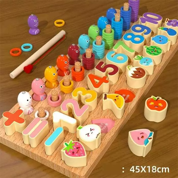 Логічна дерев’яна дошка С 74472 (18) назви англ. мовою, магнітна риболовля, вкладиші, цифри, овочі, фрукти, кольорові кільця, сортер, в коробці