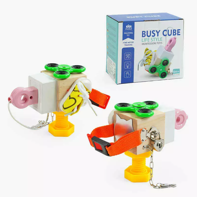 Бізіборд дерев`яний C 64879 (45) дерев’яний куб, 6 міні-ігор, в коробці