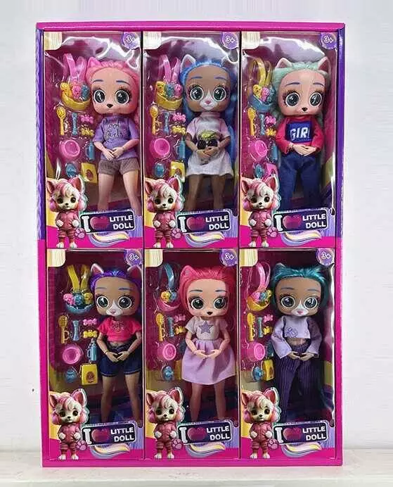 Home > Catalog > Toys > Dolls > Лялька 697 A1 (18/2) ЦІНА ЗА 6 ШТ. В БЛОЦІ, висота 27 см, руки на шарнірах, гумова голова з вушками, обличчя тваринки, знімний одяг, песики, в коробці wholesale