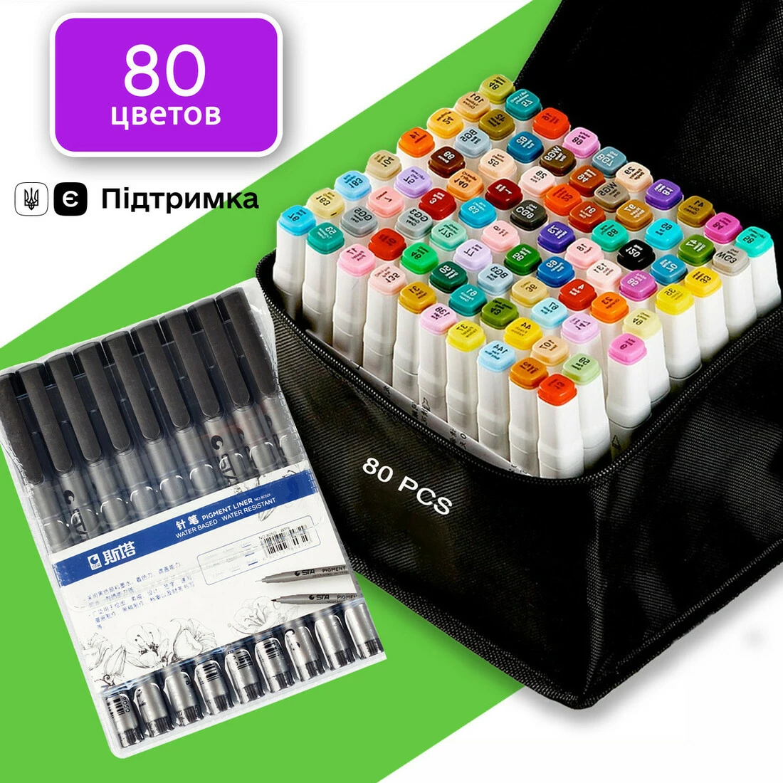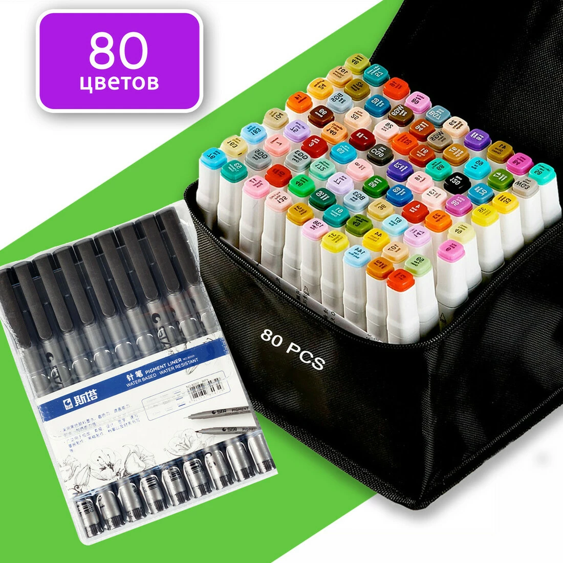 В наборе 80 маркеров разных цветов.