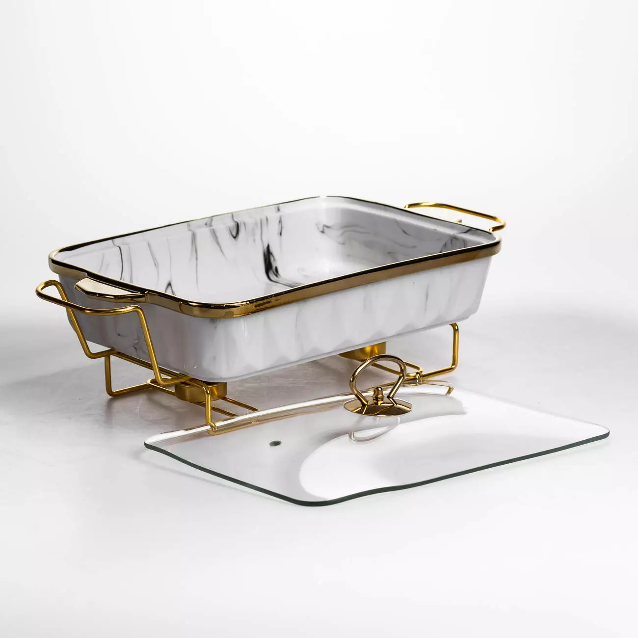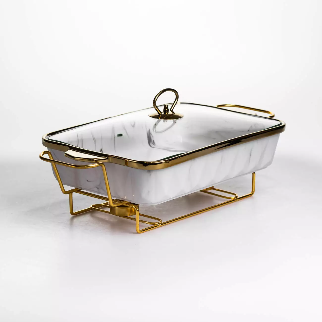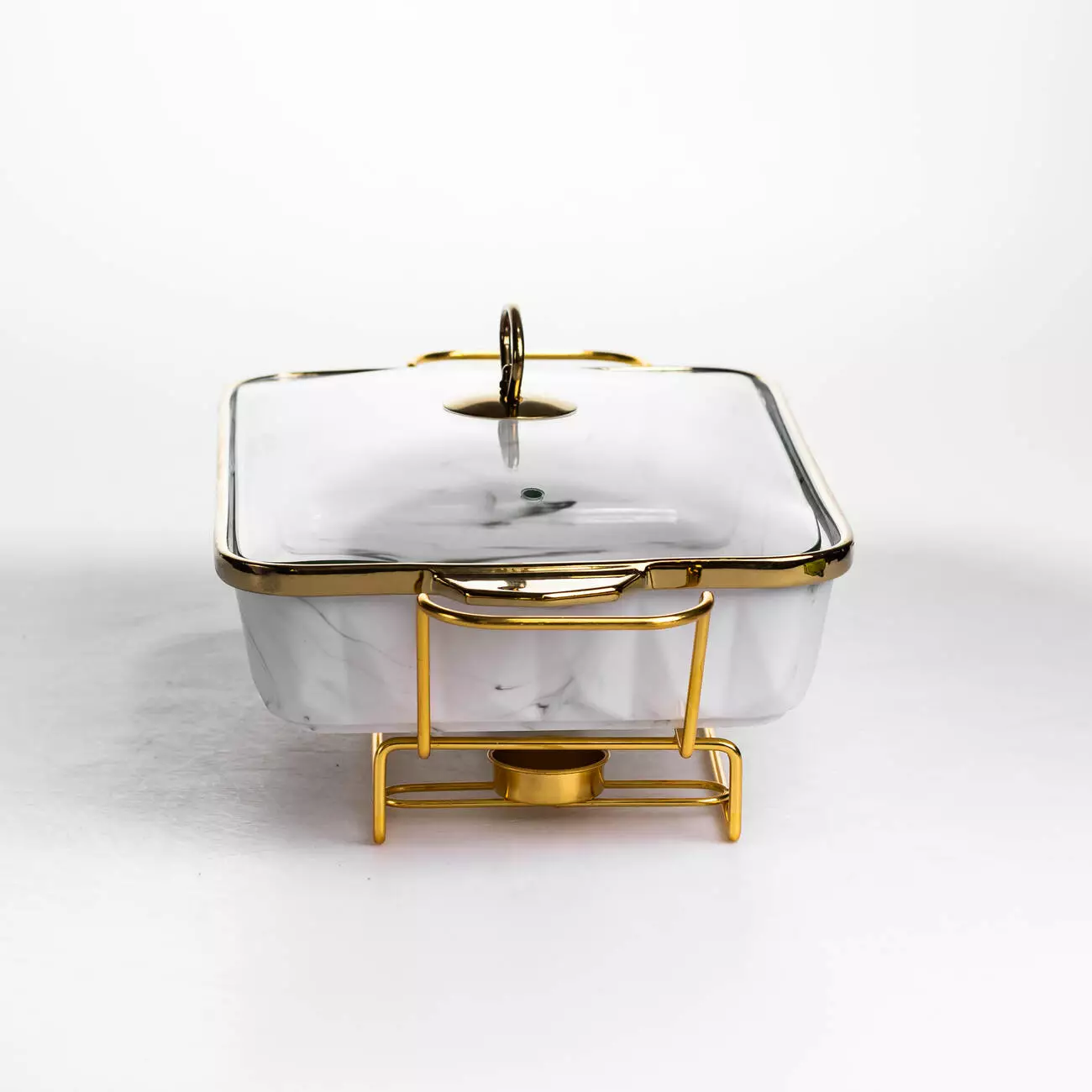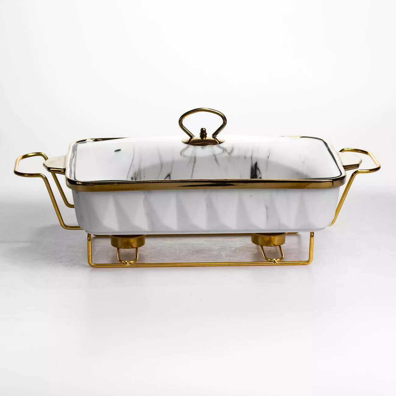 Ємність об’ємом 2 л оптимальна для гарнірів, других страв або закусок. Порцелянова чаша рівномірно утримує тепло, а металева підставка золотистого кольору забезпечує стійкість та передбачає місце для двох свічок, що сприяє більш рівномірному підігріву. Прямокутна форма дозволяє ефективно використовувати простір на столі.
