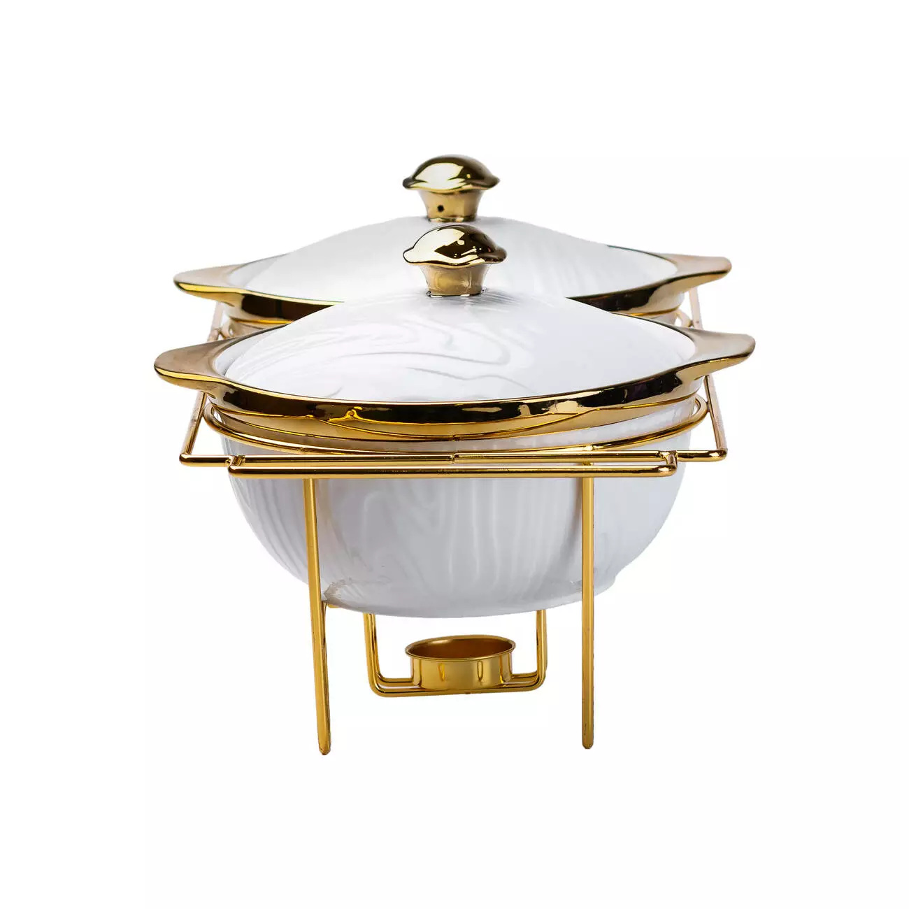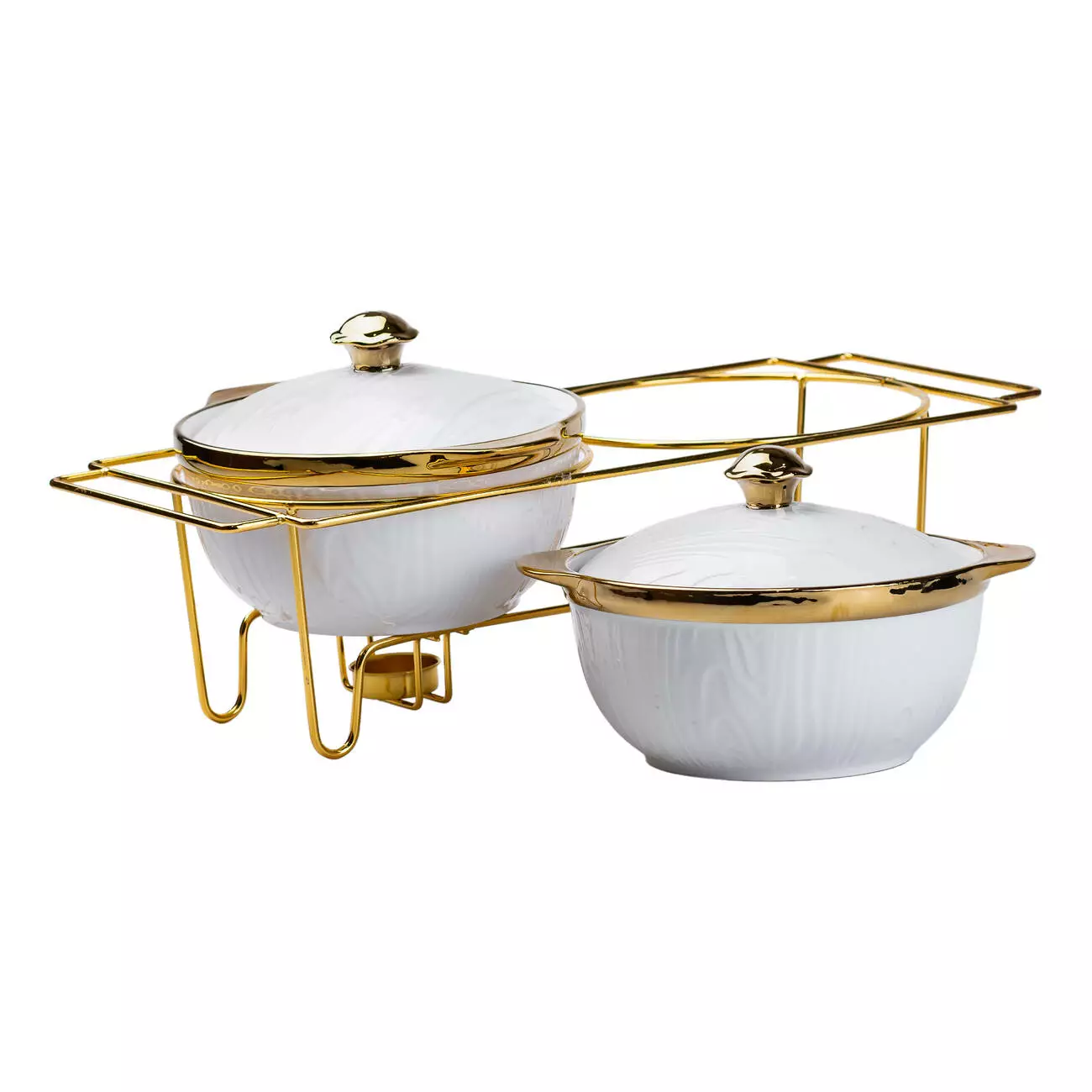 Комплект включає порцелянові кришки, які забезпечують збереження тепла та аромату страв. Ця мармітниця ідеально підходить для подачі різних страв, дозволяючи зберігати їх гарячими і готовими до подачі. Вона стане не тільки функціональним, але й естетично привабливим елементом вашого столового сервізу.