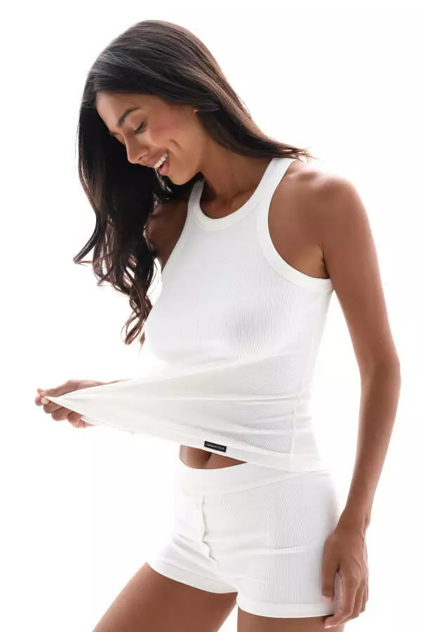 Майка на бретелях бавовняний рубчик – майка на бретелях, мінімалістична й універсальна. Підходить як для домашнього відпочинку, так і як база під жакет чи сорочку.