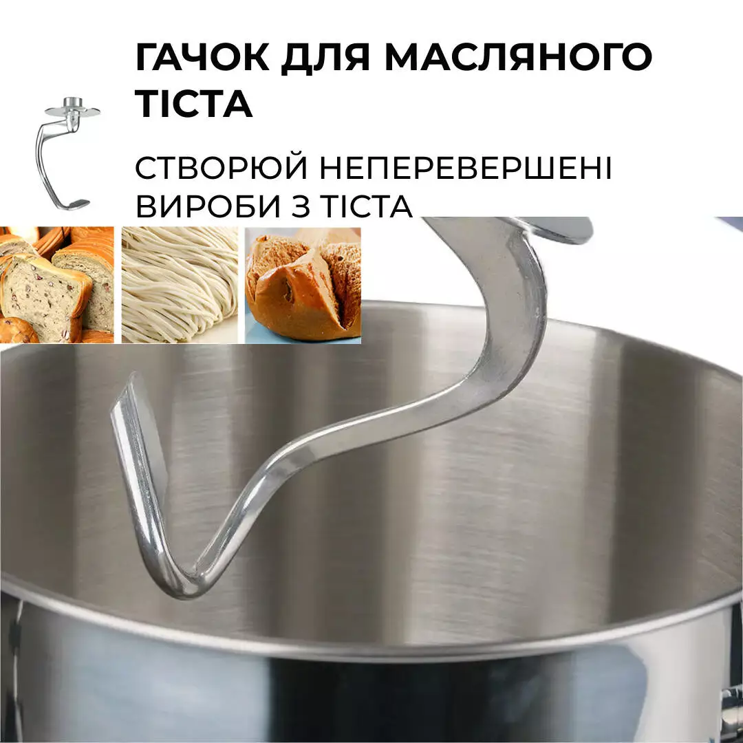 В комплект до міксера входять: крюк для тіста, який ідеально підходить для замішування тіста, вінчик для збивання, який підходить для збивання яєць, вершків, кремів та інших інгредієнтів, а також лопатка для змішування