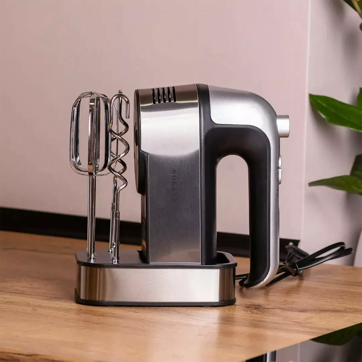 Модель оснащена двигуном потужністю 350 Вт і підтримує п’ять швидкісних режимів разом із турборежимом для короткочасної інтенсивної роботи. Це дозволяє підбирати оптимальну швидкість залежно від консистенції інгредієнтів. У комплект входять два вінчики та два гаки для тіста з нержавіючої сталі, які підходять для різних типів завдань.
