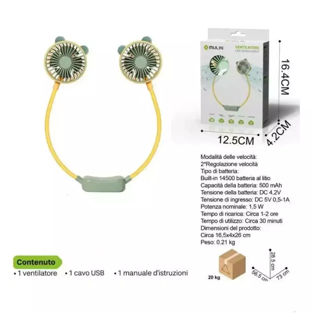 Перезаряжаемый вентилятор на шею с двумя скоростями и USB-подключением. Модель Wearable Mini Fan с гибким металлическим шлангом и симпатичным дизайном, идеально подходит для офиса и активного отдыха. Прочный корпус из ABS-пластика обеспечивает долговечность, а компактные размеры и лёгкость позволяют взять его с собой в любое место. Вентилятор имеет 360-градусную регулировку угла наклона, обеспечивая комфорт в любых условиях