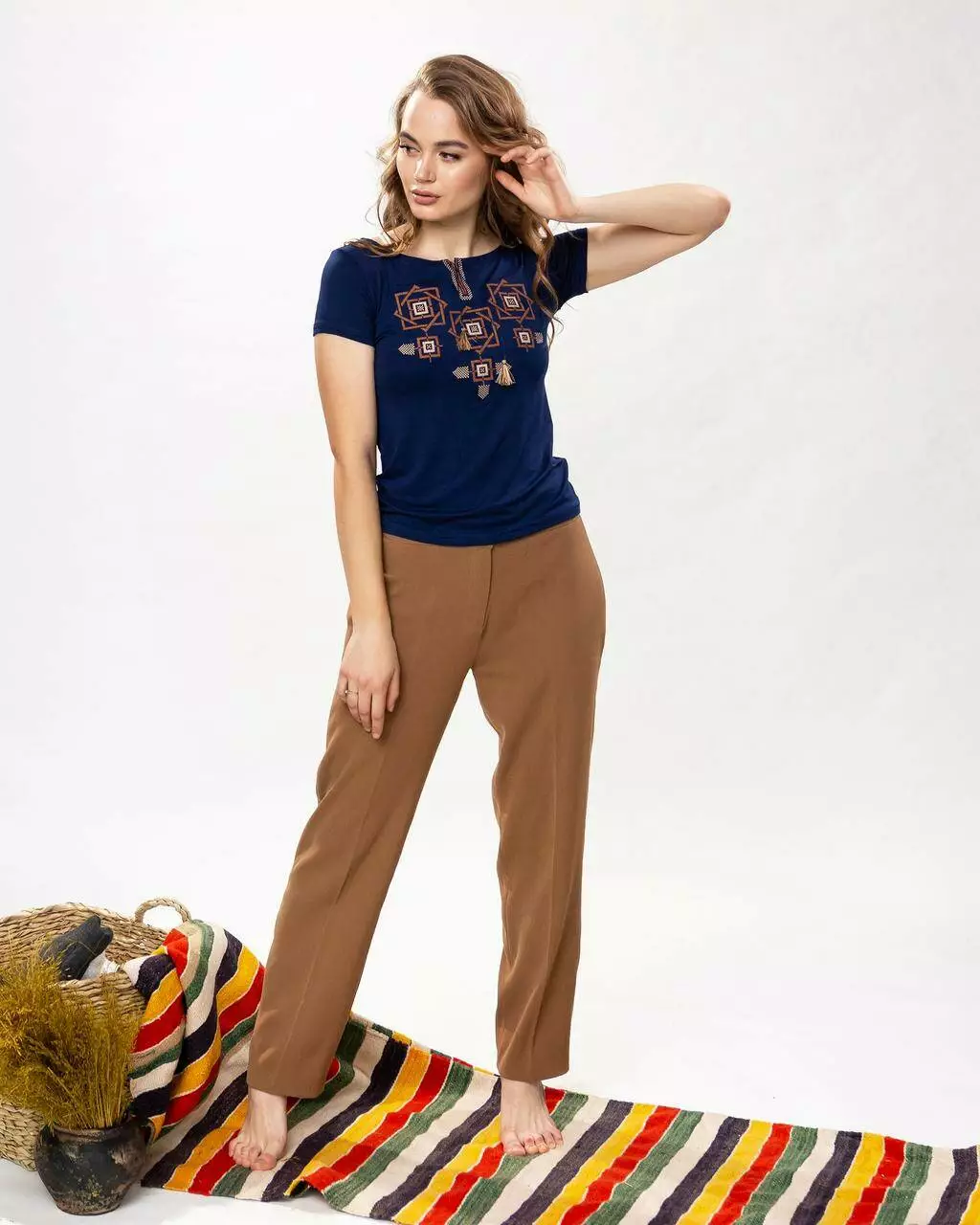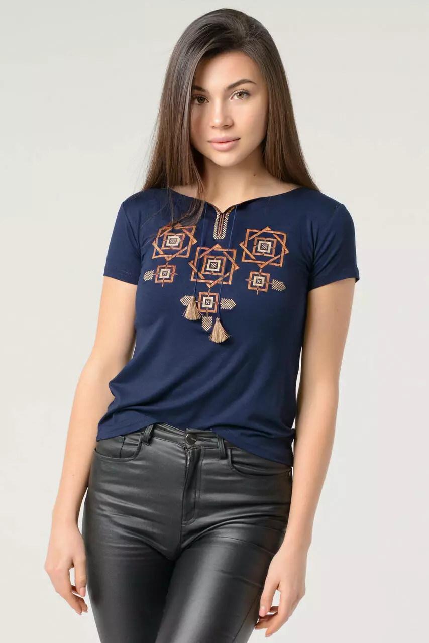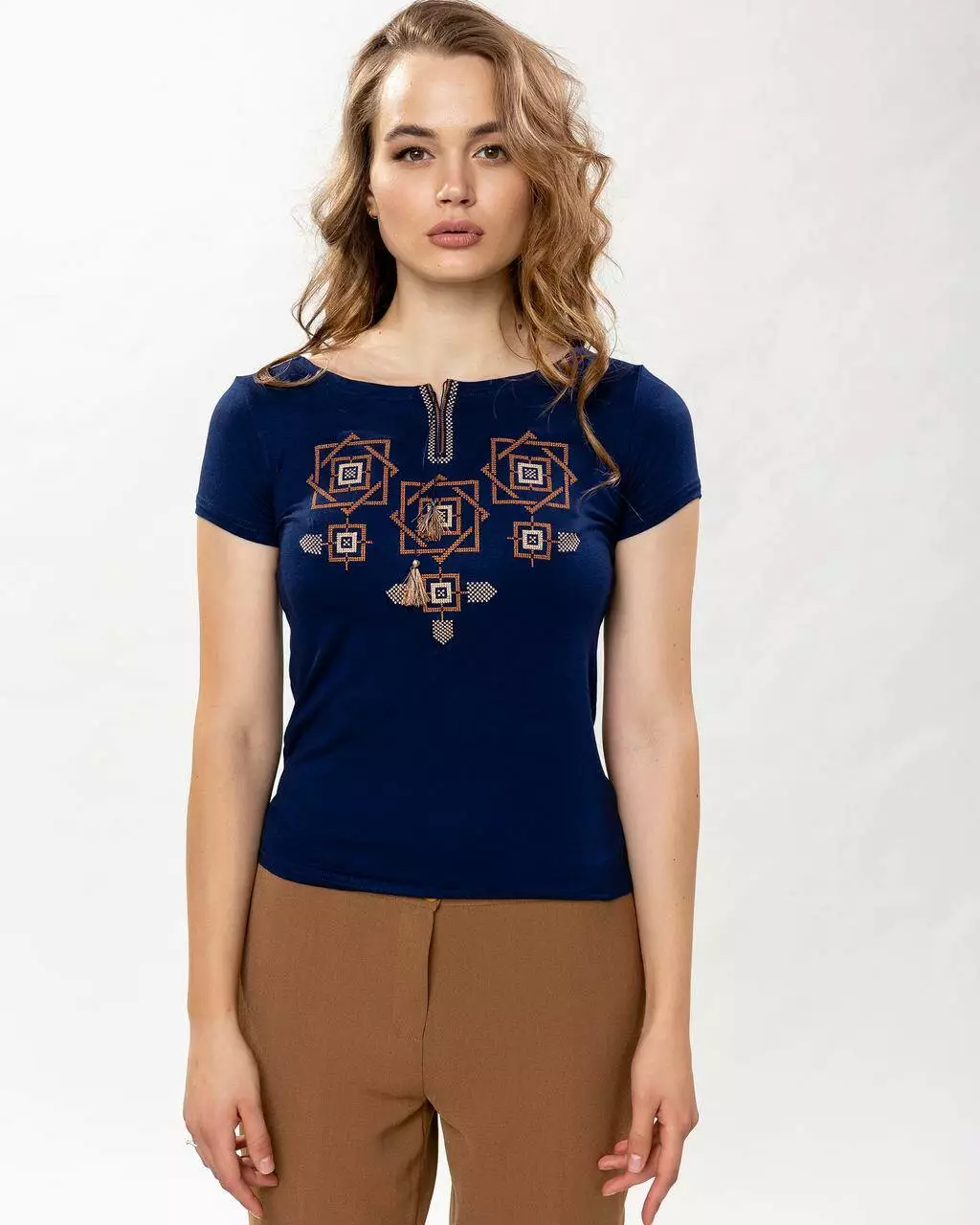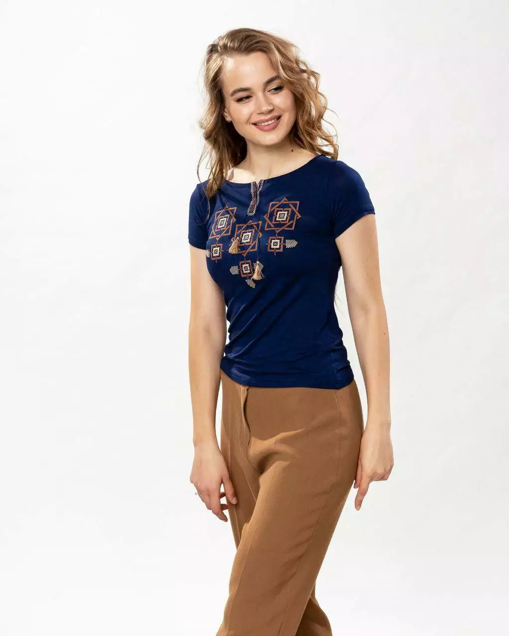 Така синя жіноча футболка із вишивкою – це незамінний атрибут у Вашому гардеробі. Доречно пасуватиме із класичними штанами та туфлями чи з джинсами й кедами. Сорочка, яка показує любов до рідної України.