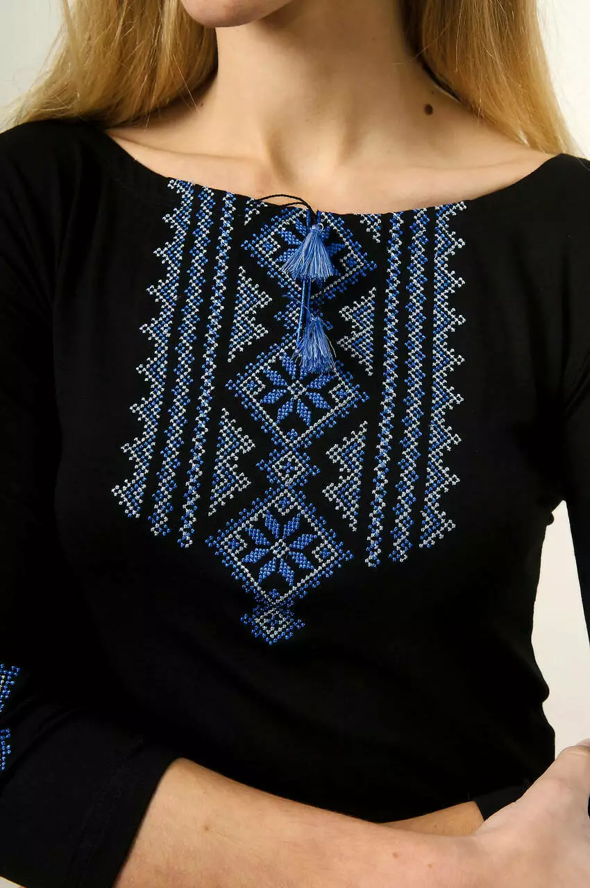 Чорна жіноча вишита футболка із рукавом ¾ із вражаючим та багатим геометричним орнаментом. Ця модель варта вашої уваги, адже вона випромінює жіночу красу, витонченість та грацію. Насичений чорний колір та блакитно-синя вишивка створюють композицію від, якої неможливо відірвати погляд. Вишита футболка довжиною рукава ¾ підійде як для носіння літом, або весною, так і просто на роботу під куртку. Геометричний орнамент лаконічно нанесений на рукавах та насичено на грудях. Перевірено, що ця модель оновить ваш гардероб та представить ваш патріотичний етно-look.