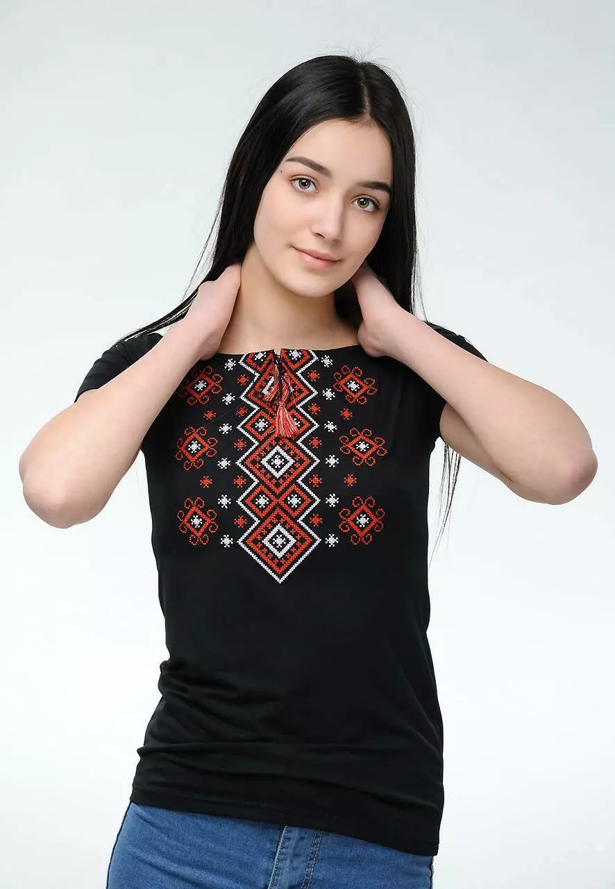 Чорна жіноча вишита футболка повинна бути у кожної українки, особливо така, як ця. Неймовірної краси стародавній гуцульський орнамент прикрашає цю вишиванку. Дизайнери намагались у такій новітній формі футболки-вишиванки передати настрій епохи. Кожен стібок ідеальний. Червоні кольори вигідно домінують на чорному тлі. Тип виконання вишивки - машинний, а саме тому Ви можете бути впевнені, що жодне прання не зіпсує цю річ вже ніколи.