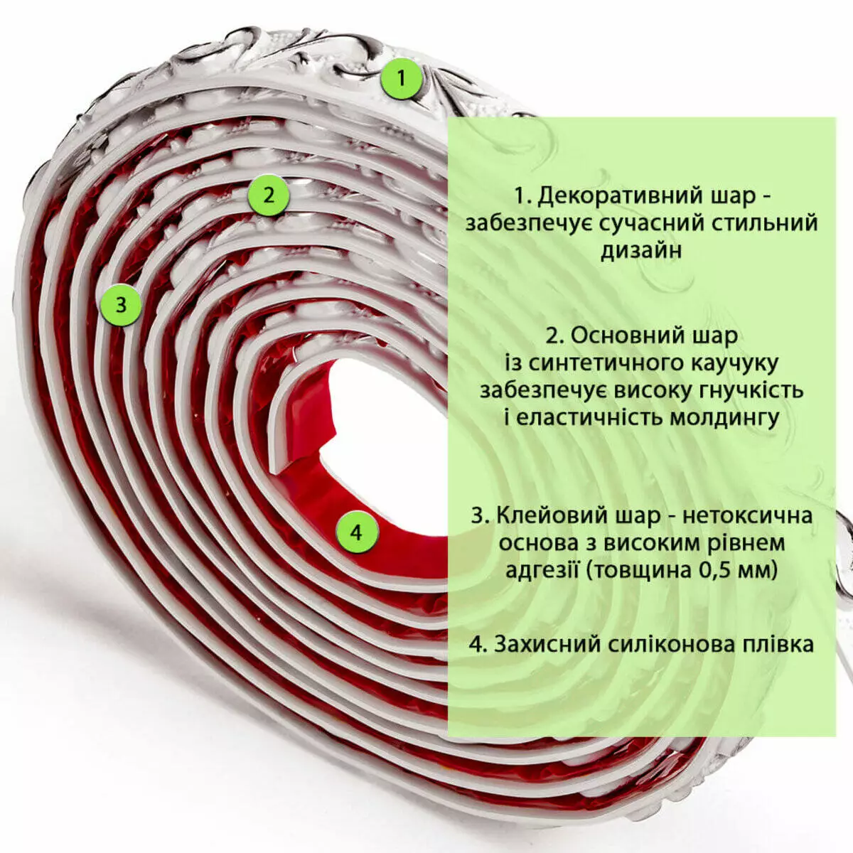 • Гнучкість та еластичність: завдяки високій гнучкості молдинг щільно повторює контури навіть вигнутих або нерівних поверхонь, не утворюючи складок чи тріщин.
