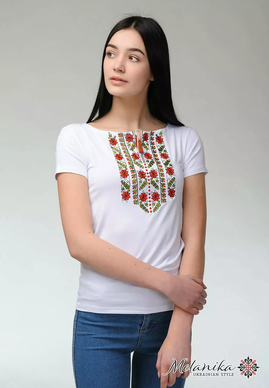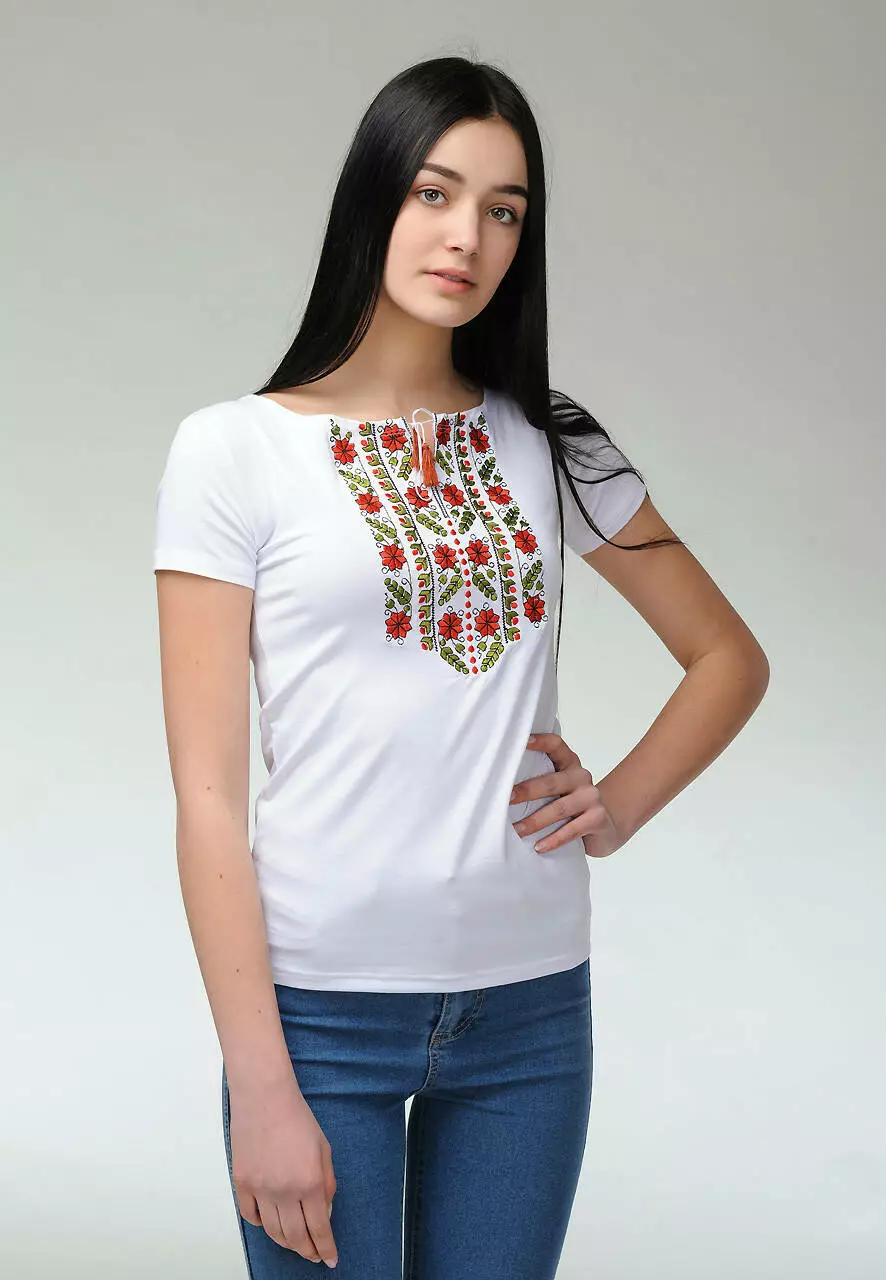Розкішна і акуратна жіноча вишита футболка на короткий рукав - справжня знахідка для гардеробу кожної модниці. У ній витримано різні стилі: буденний, святковий, класичний. М’яка та ніжна тканина, що складається з віскози та еластану, турботливо огортає Ваше тіло, підкреслюючи вигідні переваги фігури. Висока якість основної тканини забезпечує максимальний захист від деформації після прання.