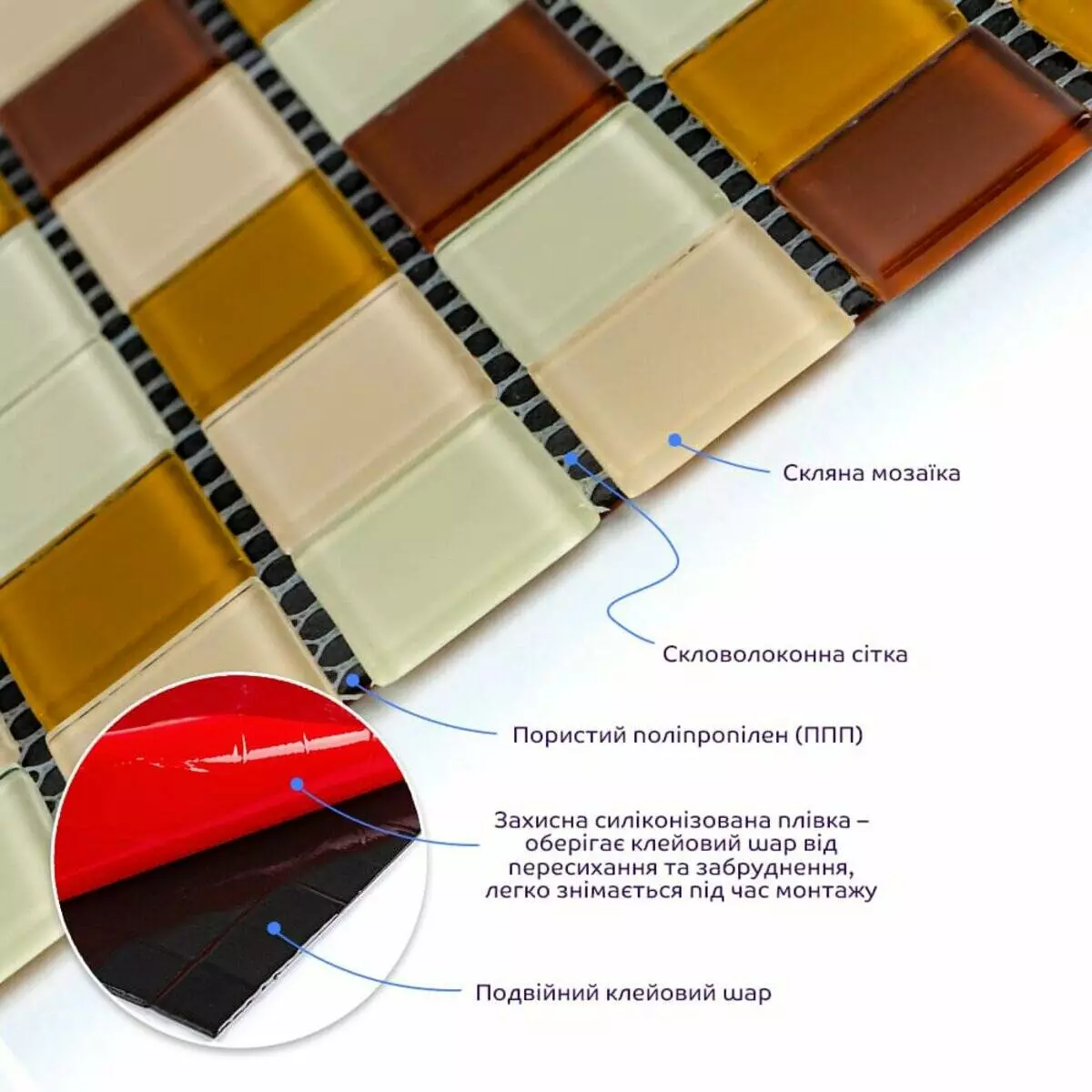 Опис: Скляна мозаїка — це елегантний декоративний матеріал, який відмінно підходить для створення яскравих акцентів в інтер’єрі. Завдяки клейовій основі, мозаїка швидко монтується та ідеально підходить для обробки різноманітних поверхонь, зокрема стін у ванних кімнатах та кухнях.