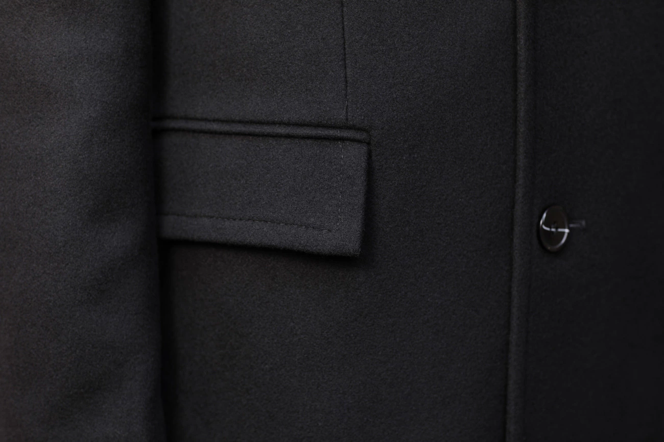 Пальто достаточно функциональное, помимо внешних прорезных карманов с клапаном, есть нагрудный карман для платка-паше и внутренний скрытый карман для хранения денег. Также несколько особых деталей делают эту модель оригинальной и отличающейся: аккуратная красная лейба на рукаве немного разбавляет общий черный фон, качественная фурнитура делает его богаче, а отделка дополнительной строчкой на лацканах добавляет изящности. Благородный черный цвет и простота силуэта позволяет комбинировать пальто не только с классическими, но и повседневными вещами.