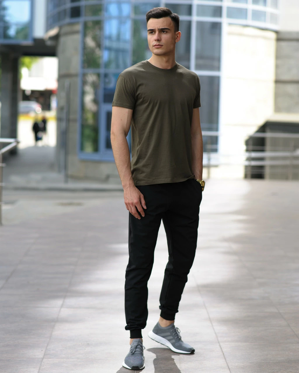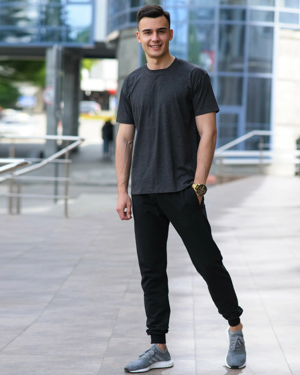 Мужской комплект - черные спортивные штаны и светло-серая футболка (весна/лето/осень)