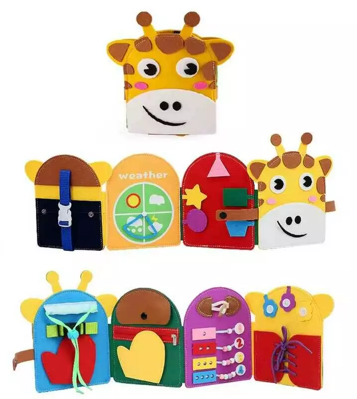 М`яка книжка-бізіборд C 73111 (40)“Жирафа”, фетр, розкладається, пальчикові ігри, рахівничка, аналоговий годинник, регуль. ремінець, шнурівка, в пакет