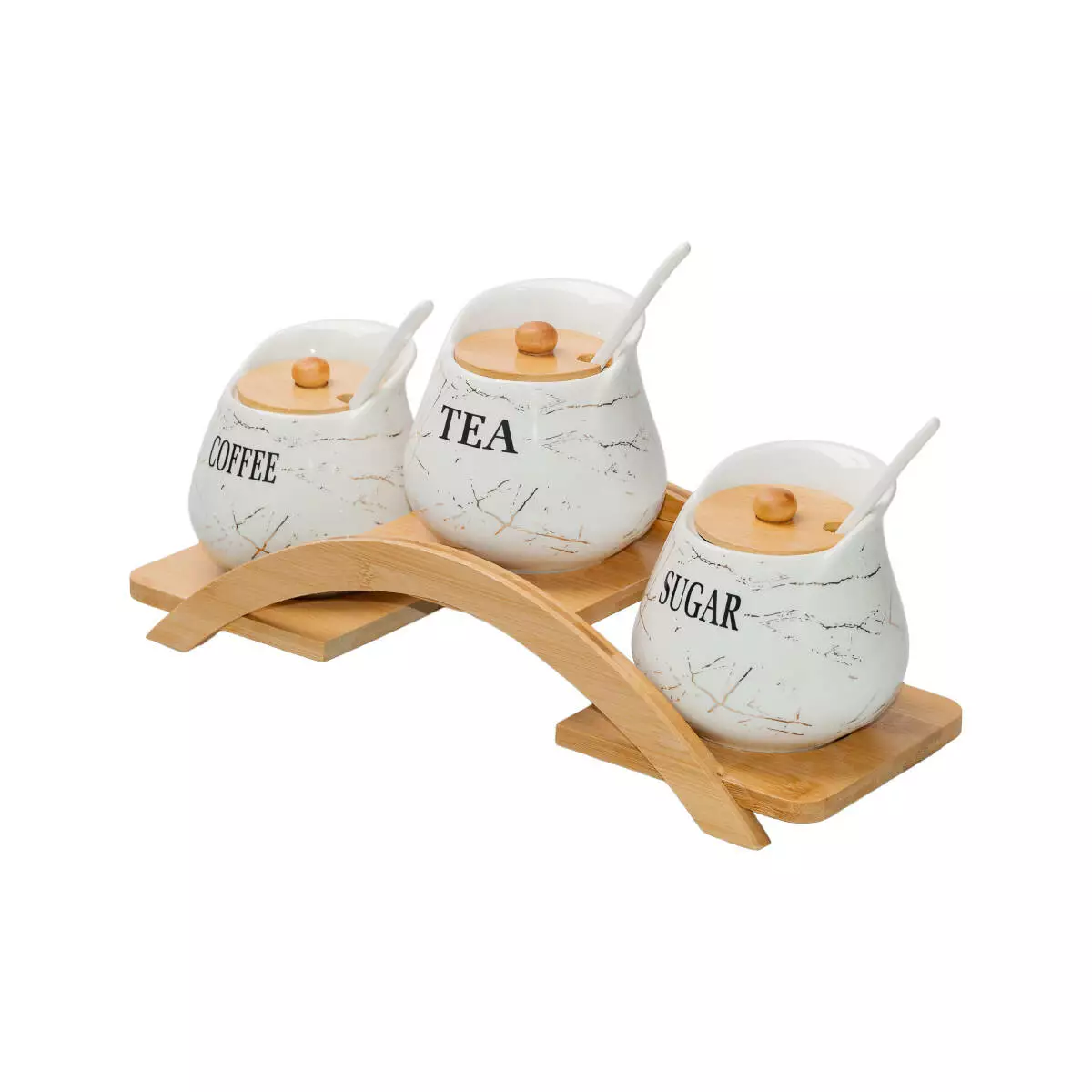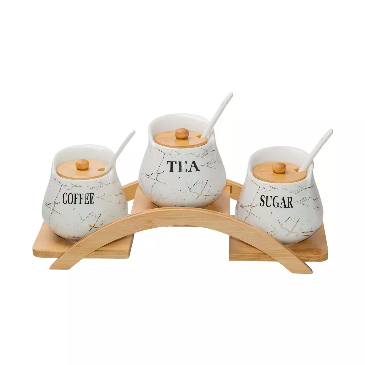 На кожній баночці є напис SUGAR, COFFEE і TEA, що допомагає швидко знайти потрібний продукт. Комплектується бамбуковою підставкою, яка додає зручності у зберіганні та організації на кухонному столі.