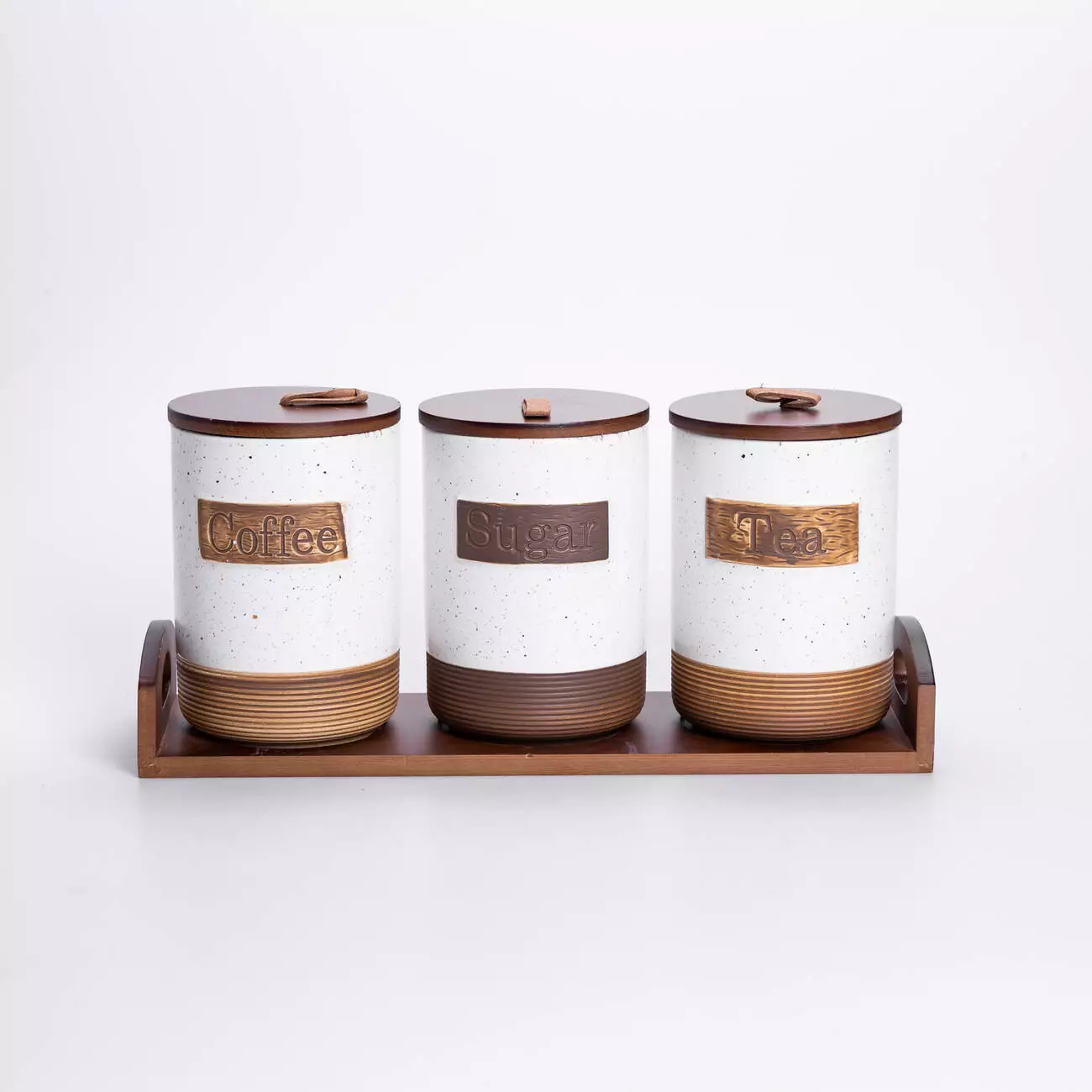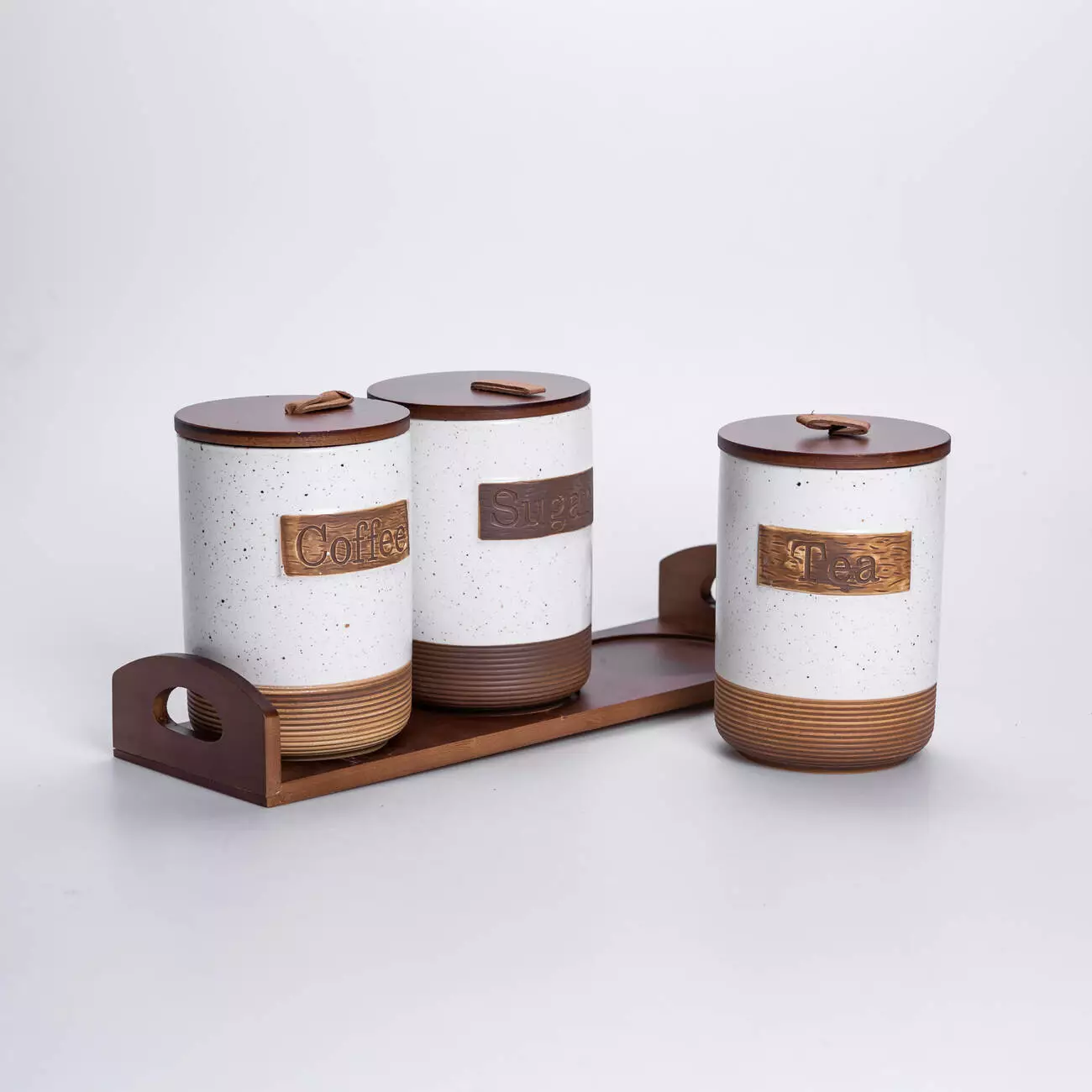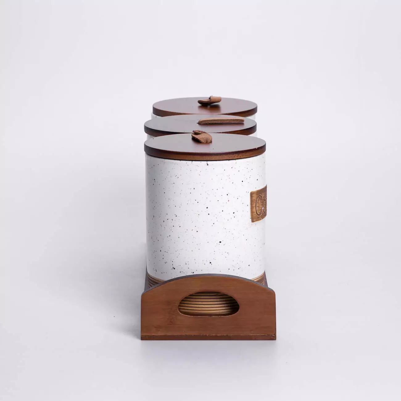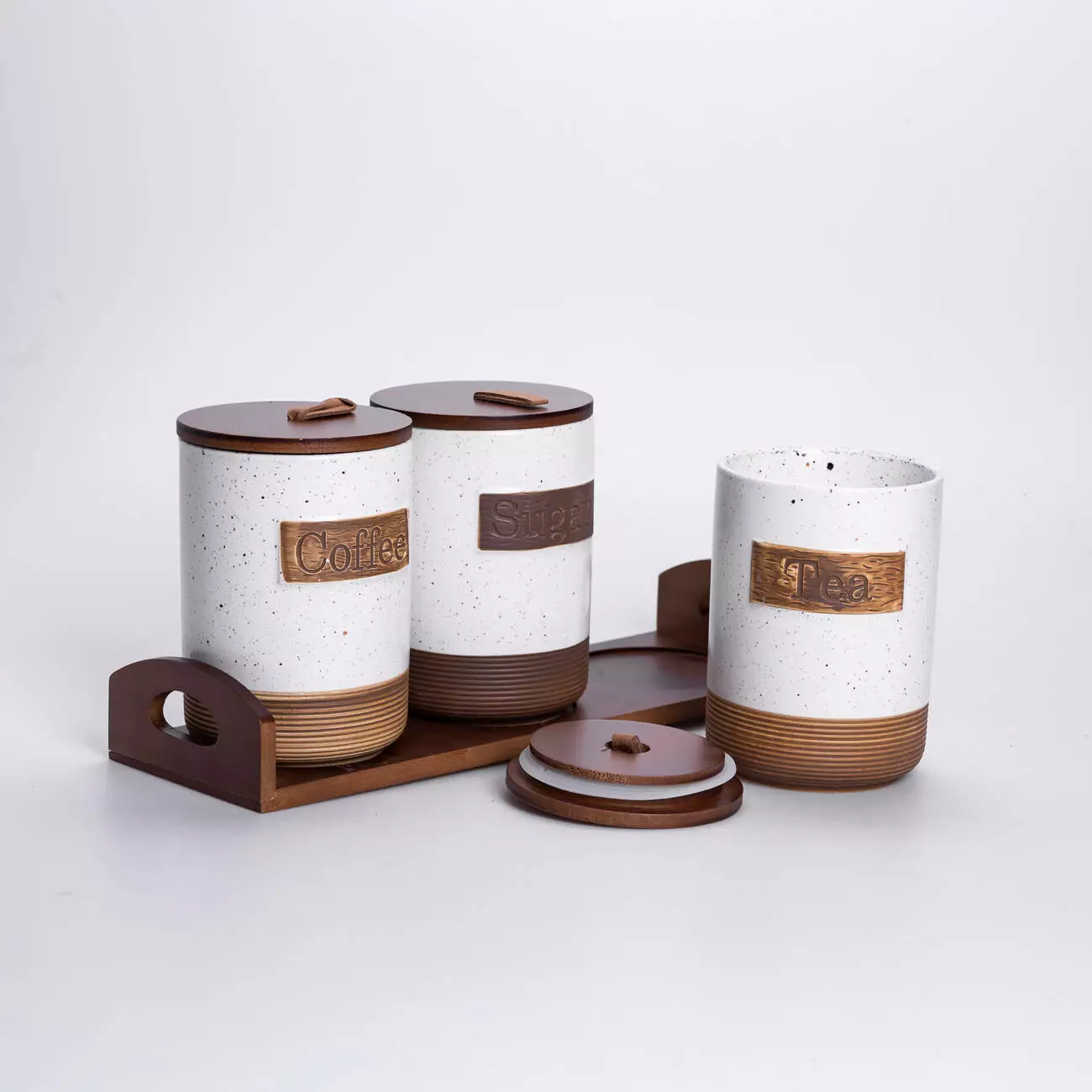 Комплект складається з 3 банок, розташованих на бамбуковій підставці, яка забезпечує стабільність і порядок на кухонній поверхні. Кришки також виконані з бамбуку, вони щільно закриваються та допомагають зберегти свіжість продуктів. Візуально набір поєднує природні матеріали та мінімалістичний дизайн, що робить його доречним у більшості сучасних інтер’єрів кухні.