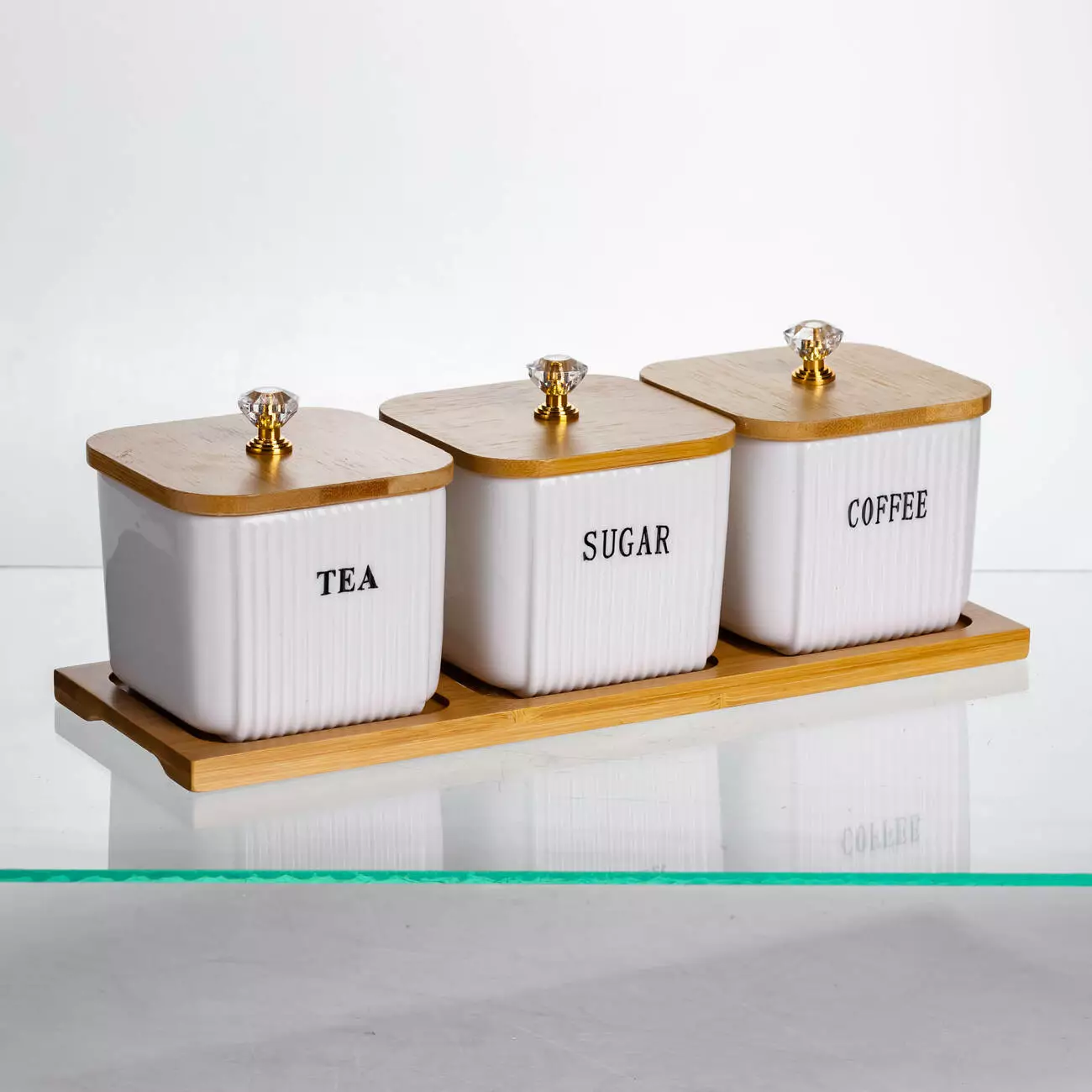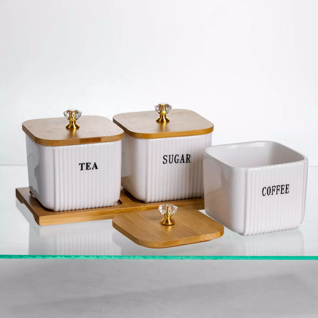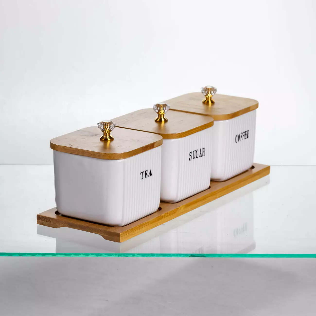 Банки виготовлені з порцеляни з рельєфною поверхнею, а кришки — з бамбука, доповнені прозорими декоративними ручками у формі кристалів. Вони щільно прилягають до ємностей, захищаючи вміст від вологи та сторонніх запахів. Висота банок — 7 см, що робить їх зручними для розміщення на полицях або в шафі.