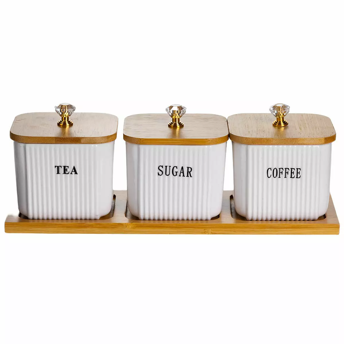 Набір із трьох банок об’ємом по 350 мл призначений для зберігання чаю, кави та цукру або інших сипучих продуктів. Компактне розміщення на бамбуковій підставці дозволяє зручно організувати кухонний простір, зберігаючи порядок і доступність. Кожна банка має чітке маркування, що спрощує щоденне користування.