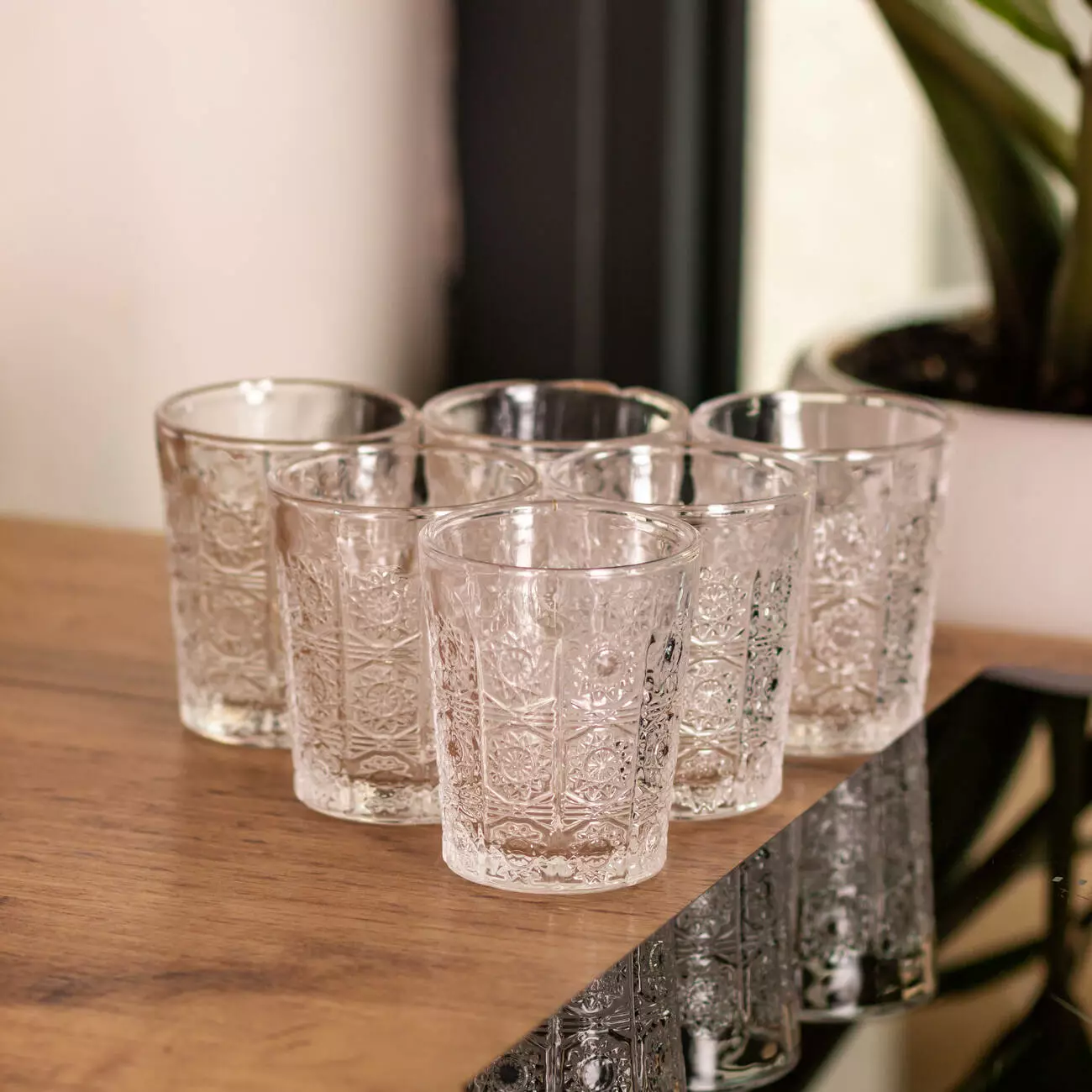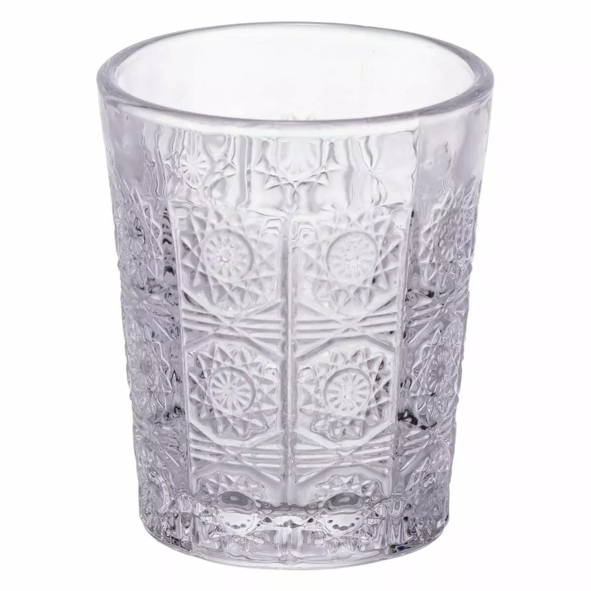 Поверхня виробів прикрашена рельєфним візерунком у вигляді стилізованого соняшника. Такий дизайн не лише додає виразності, а й підкреслює гру світла на склі. Щільна фактура сприяє комфортному триманню в руці, а декоративний малюнок створює візуальний акцент під час сервірування.