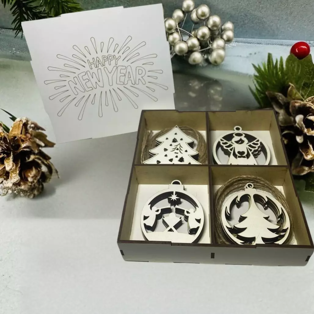 Набір дерев'яних ялинкових іграшок "Happy New Year" стане стильною