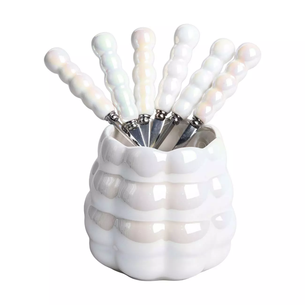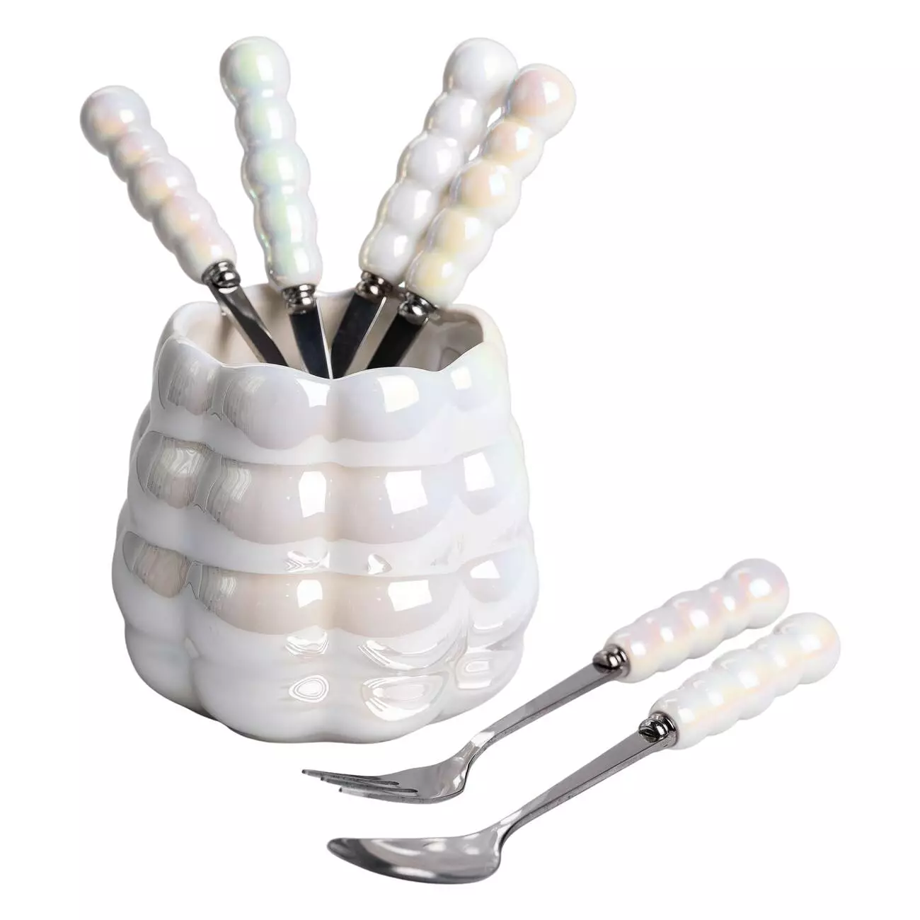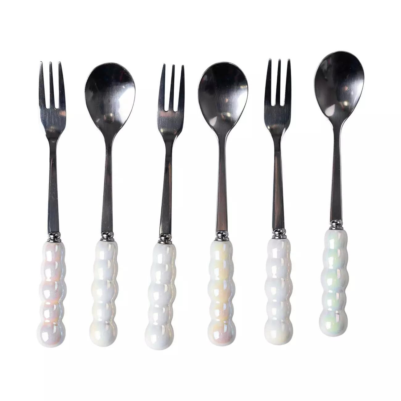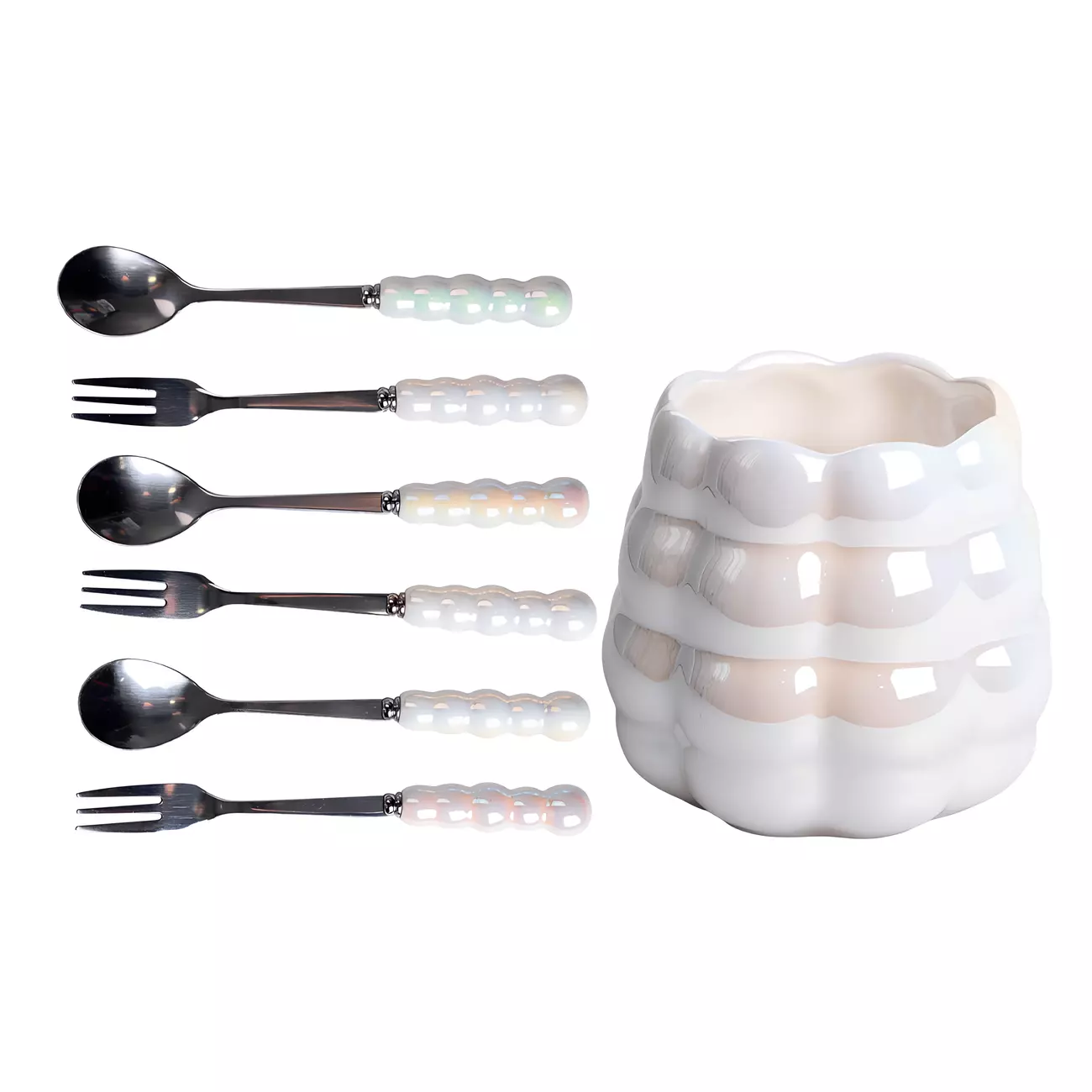 Набір десертних виделок та ложок на порцеляновій підставці, перламутровий