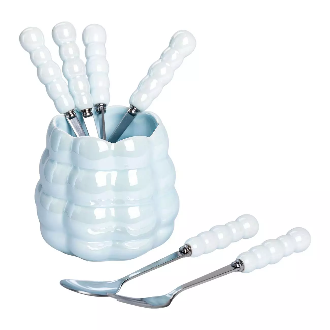 нержавіючої сталі. Ручки приборів порцелянові, оформлені у вигляді