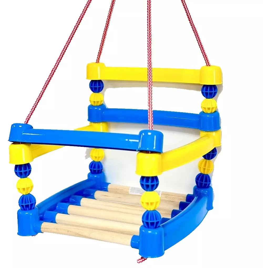 Дитяча гойдалка підвісна – дерев’яне сидіння, пластикові бортики. Матеріал – дерево бук / пластик. Яскрава дитяча гойдалка підвісна доставить масу незабутніх моментів Вашій дитині. Розрахована на вагу до 40 кг. Мотузки товсті , міцні – 12 мм.