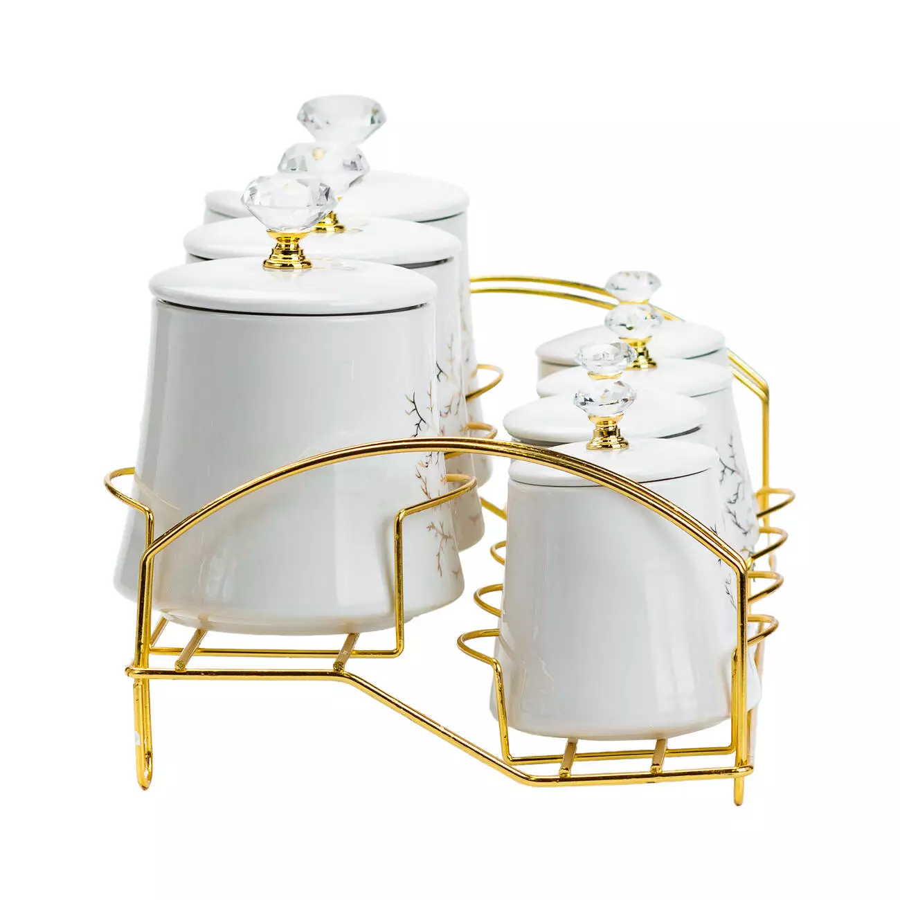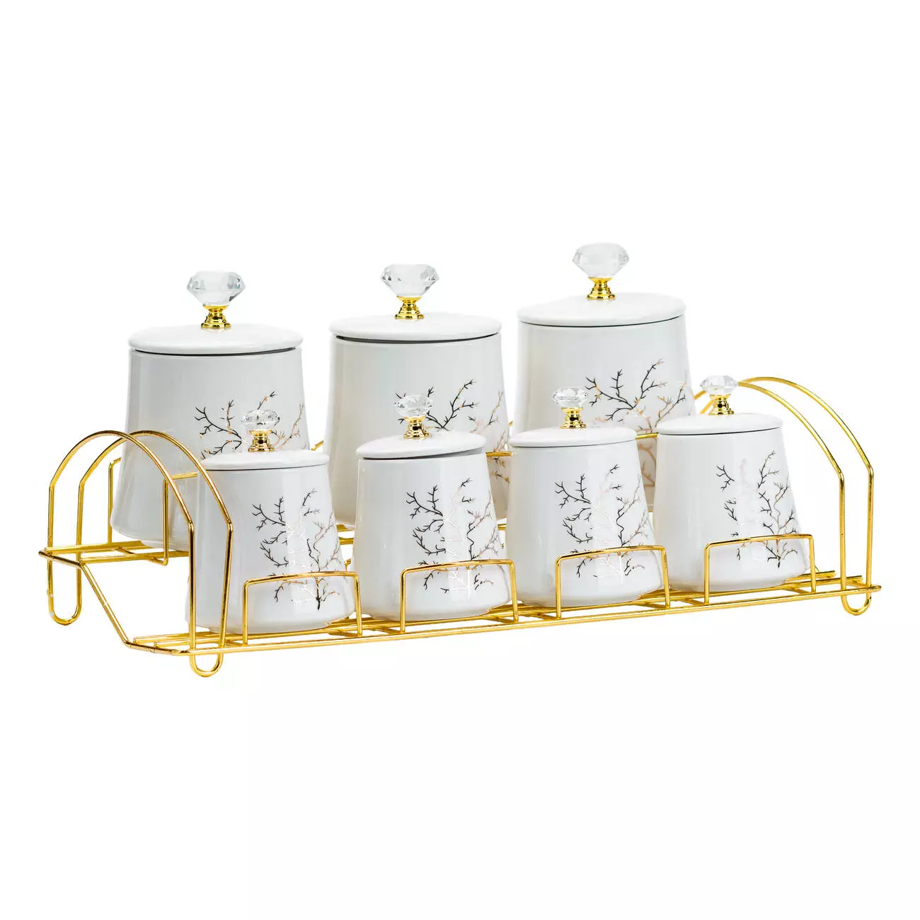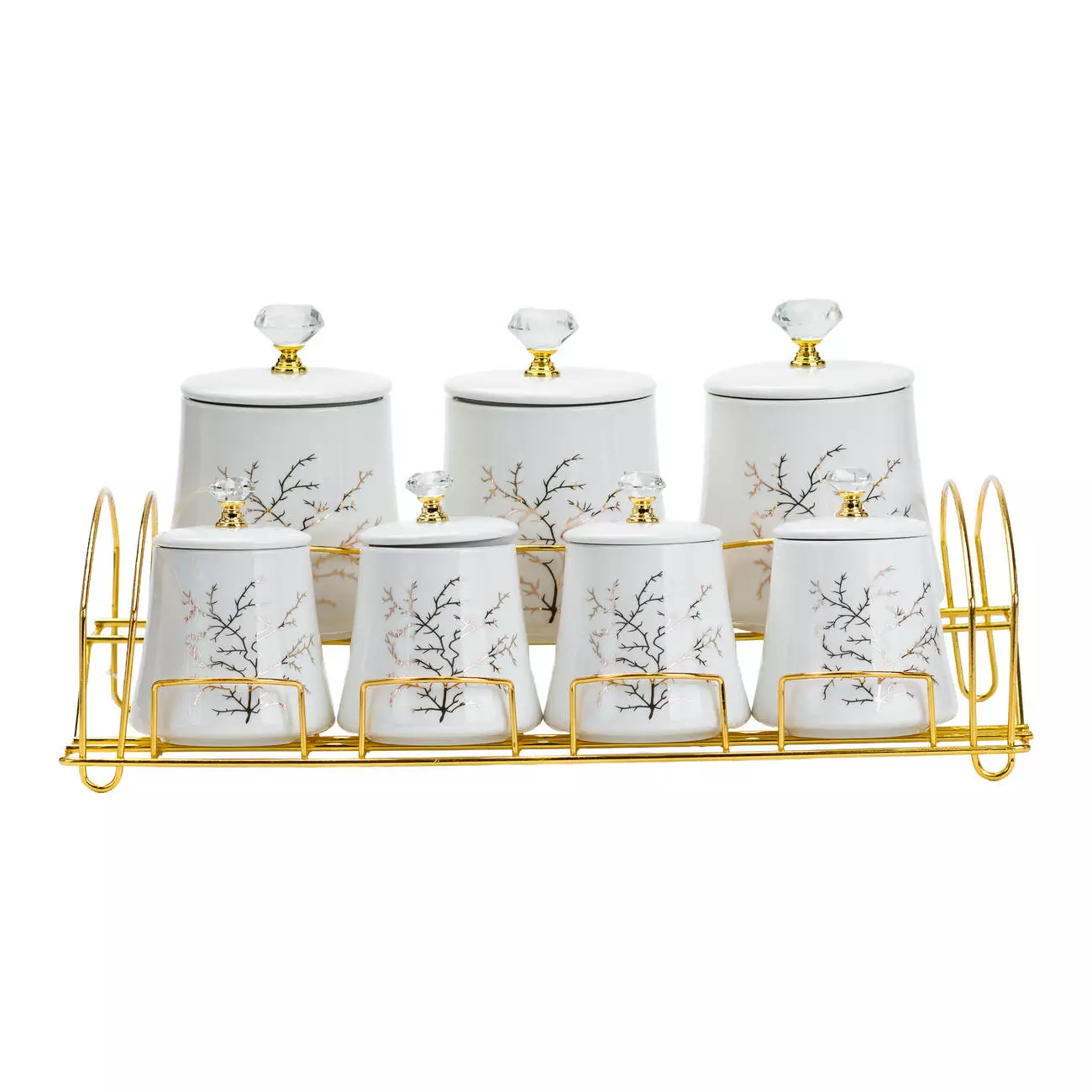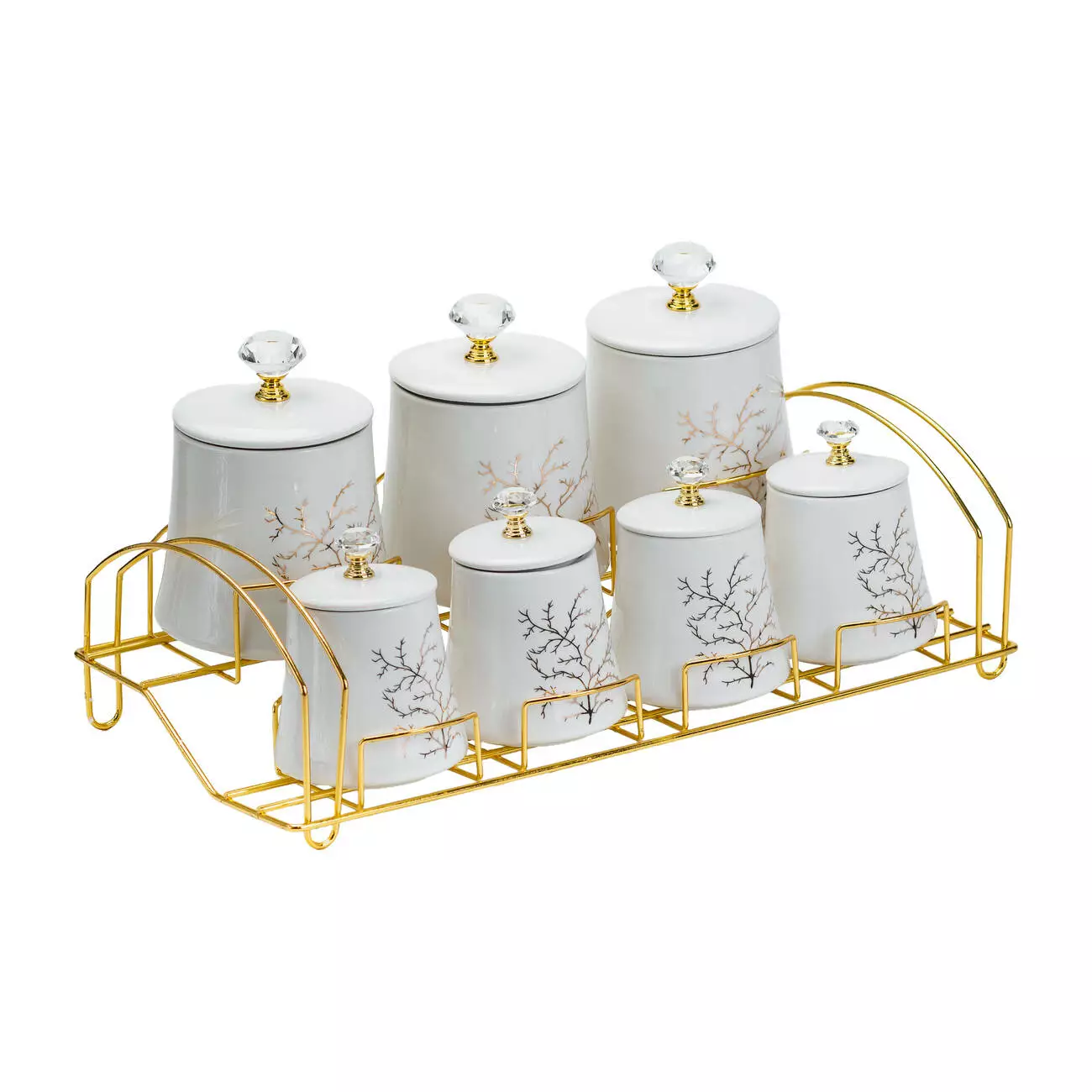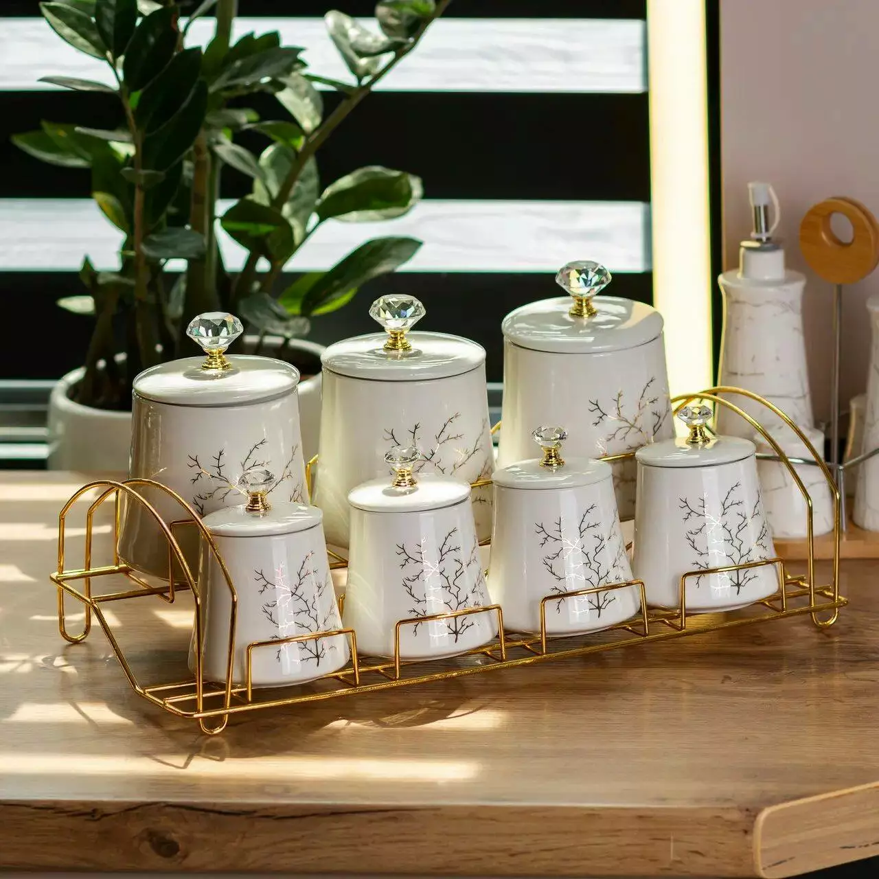 Золотиста металева підставка додає набору розкішного вигляду та зручна у використанні. Підставка компактно розміщує всі баночки, економлячи простір на вашій кухні.