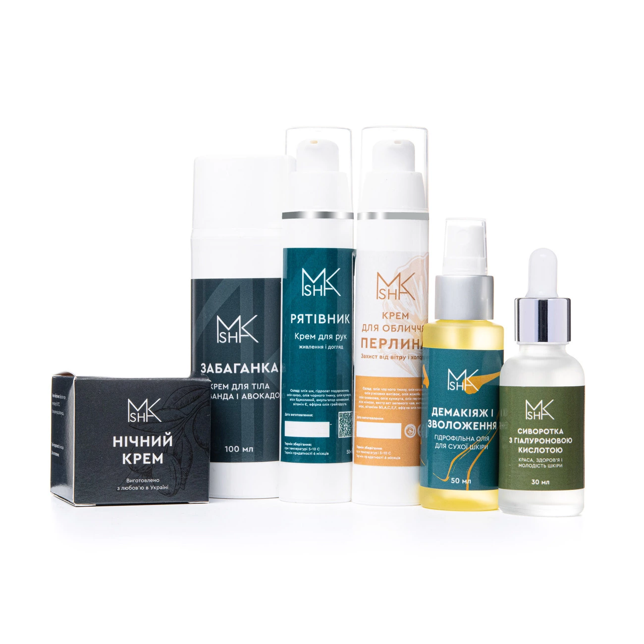 Склад набору: гідрофільна олія для сухої шкіри «Демакіяж і зволоження», крем для тіла «Забаганка», крем для обличчя «Перлина», сироватка з гіалуроновою кислотою, крем для обличчя «Нічний», крем для рук «Рятівник».