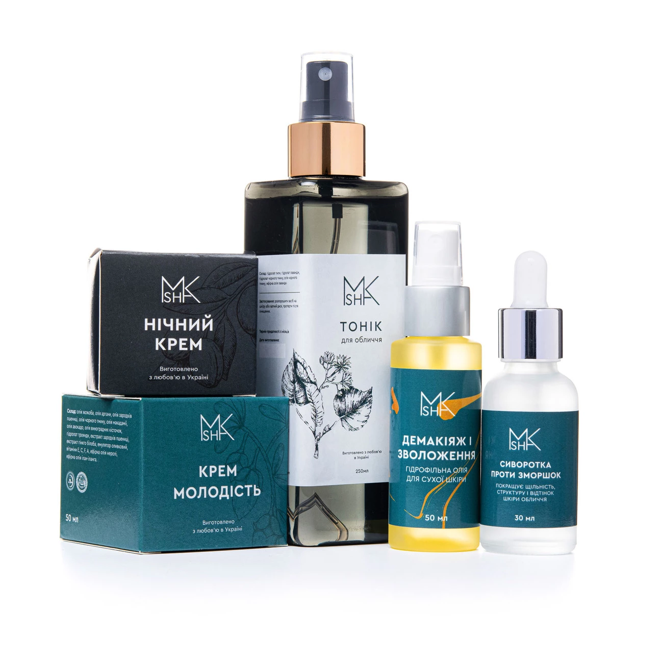 Склад набору: тонік для обличчя, гідрофільна олія для сухої шкіри «Демакіяж і зволоження», сироватка проти зморшок, крем для обличчя «Молодість», крем для обличчя «Нічний».