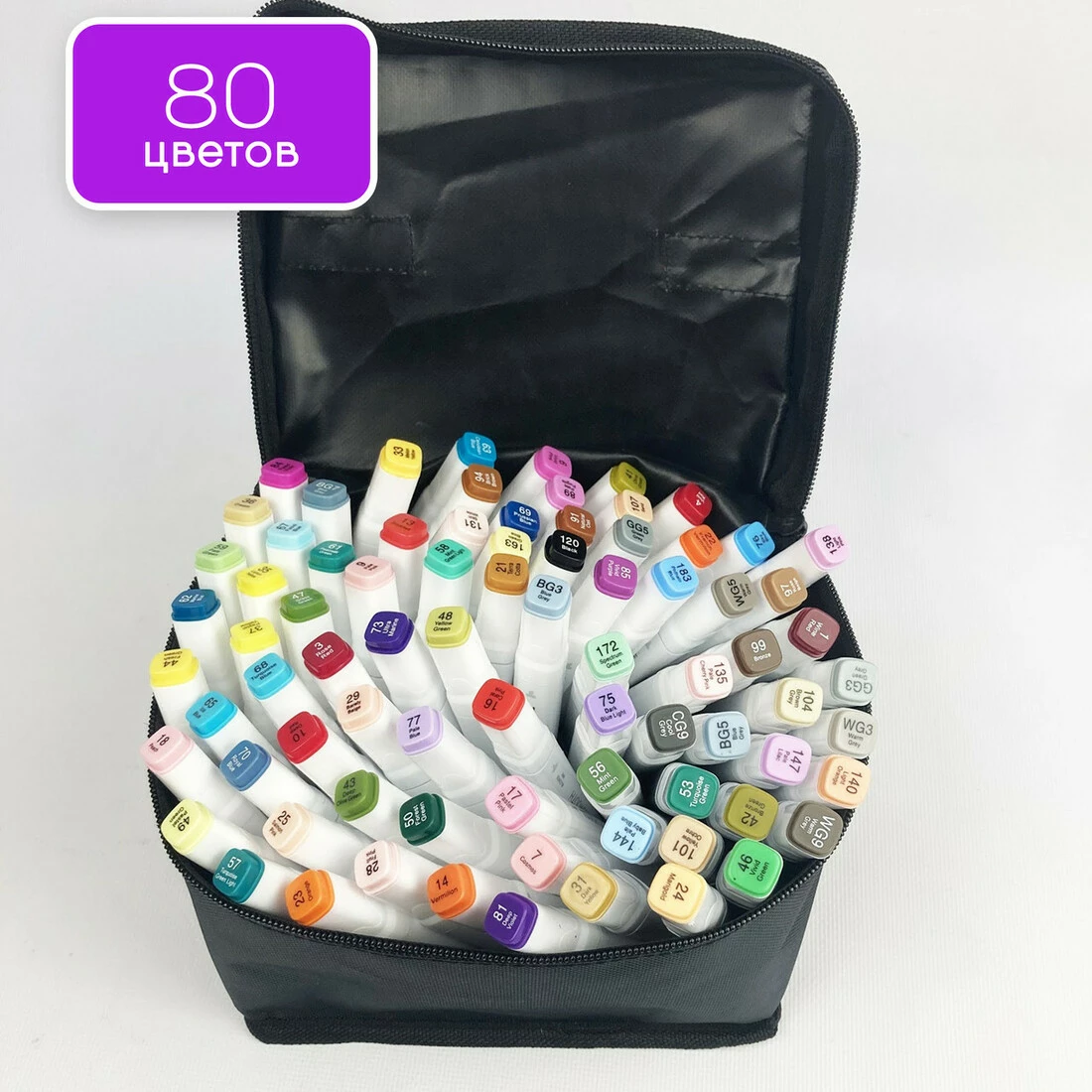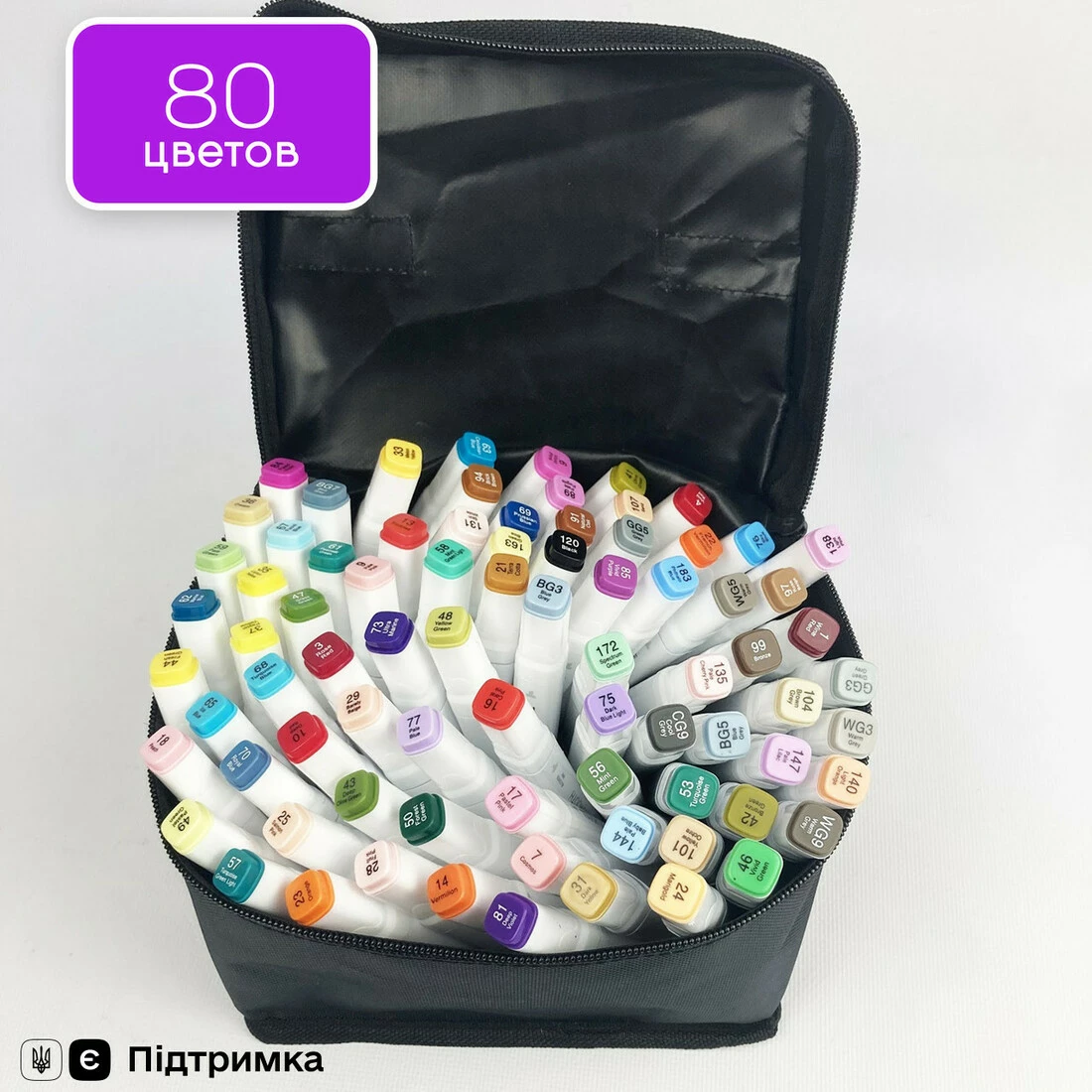 У наборі 80 маркерів різних кольорів.