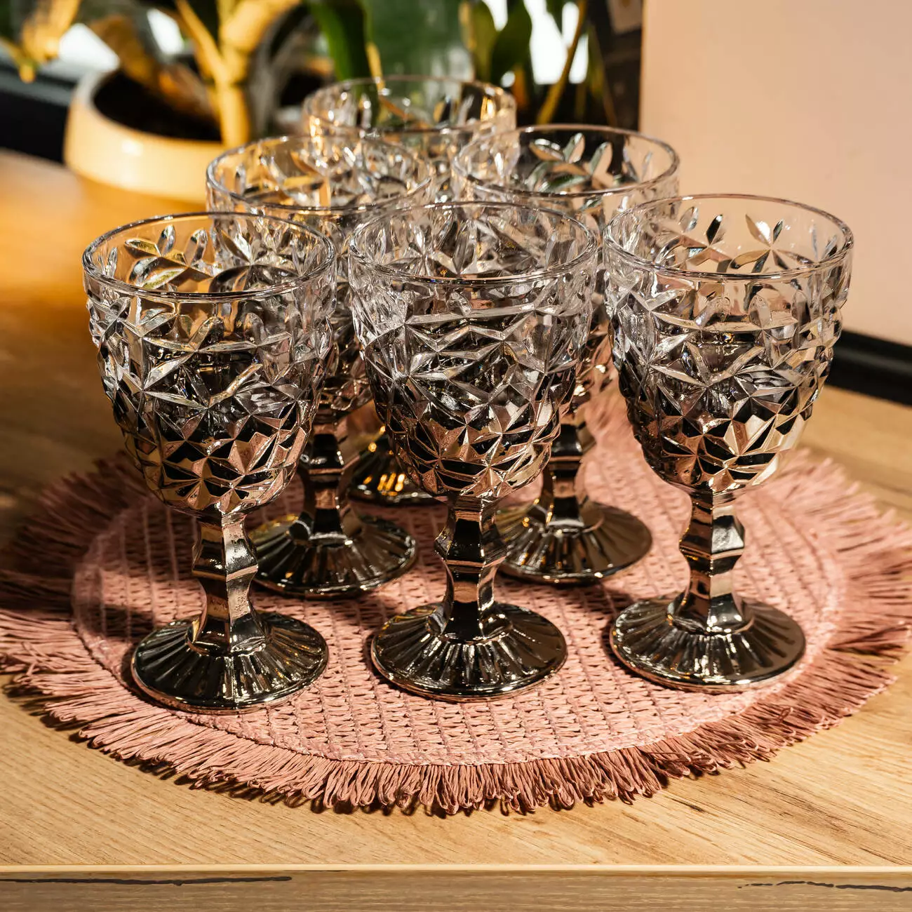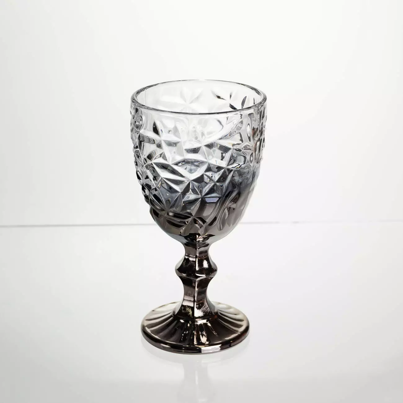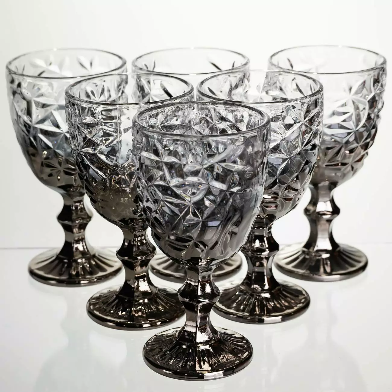 Набір келихів по 240 мл з фактурним візерунком їхнього ефектного димчастого скла - елегантний та практичний комплект для святкового та повсякденного сервірування. Об'єм оптимальний для вина, безалкогольних напоїв та порційних коктейлів.