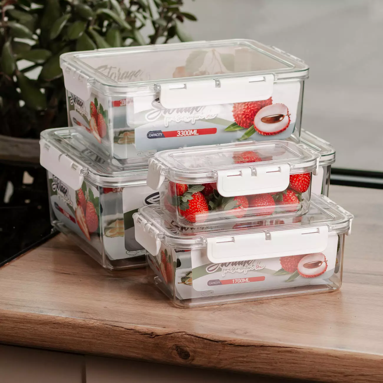 Об’єми контейнерів: 5.7 літра (висота 10 см), 3.3 літра (8 см), 1.7 літра (6.5 см) та 0.7 літра (5 см). Різні розміри дають змогу зберігати як великі об’єми продуктів, так і невеликі порції — від овочів і залишків страв до закусок або перекусів у дорогу. Прозорі стінки дозволяють легко бачити вміст, не відкриваючи контейнер. Універсальність формату підходить для щоденного використання вдома, на роботі або під час подорожей.