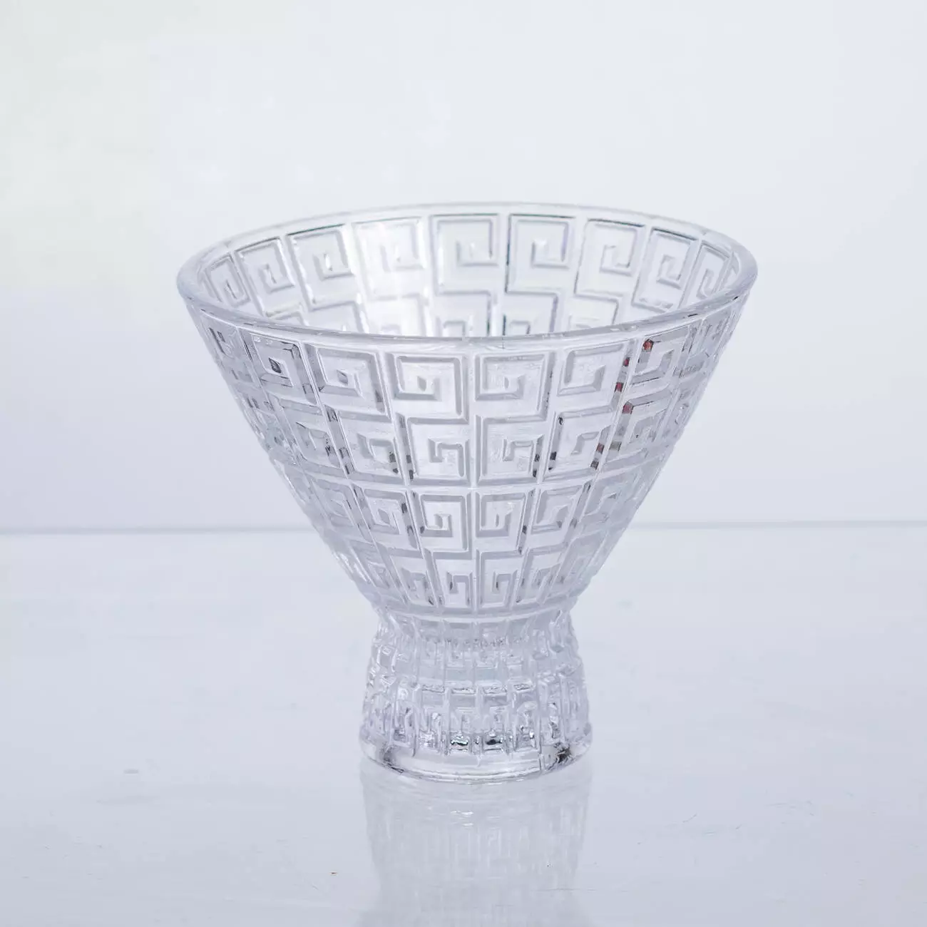 Набір із трьох креманок виготовлений із прозорого товстого скла, що поєднує естетику та практичність. Кожна креманка має геометричний візерунок у стилі грецького ключа, який додає вишуканості та підходить для сервірування десертів, фруктів або закусок.