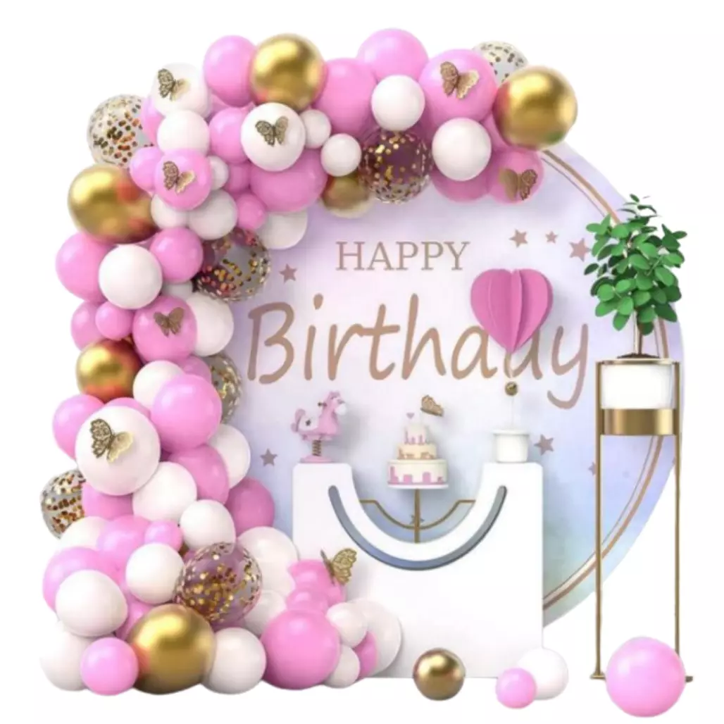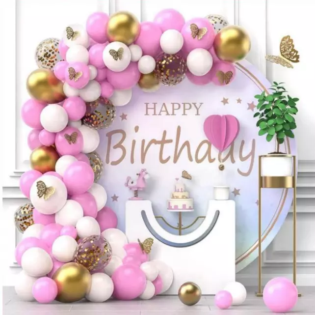 та рожеві, а також прозорі кулі з золотими конфетті, що надає
