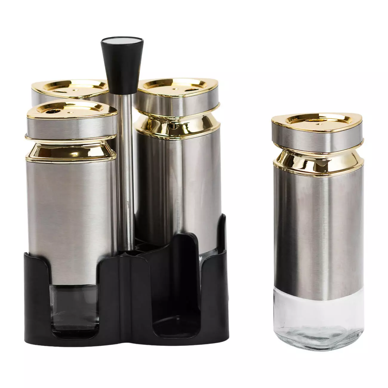 Набір для спецій з чотирьох баночок зачаровує своєю елегантністю та функціональністю. Баночки хромованого кольору із золотими акцентами додають витонченості, створюючи гармонійний вигляд, який ідеально доповнить будь-яку кухню. Чорна підставка виготовлена з якісного пластику та металу, забезпечуючи стабільність і довговічність.