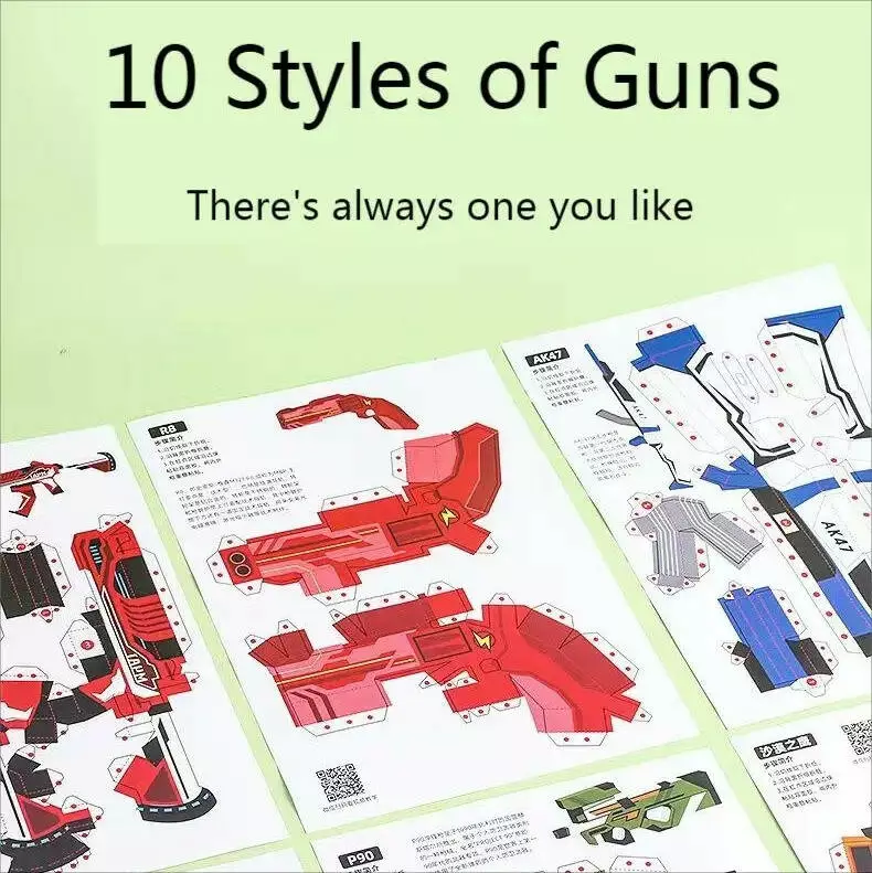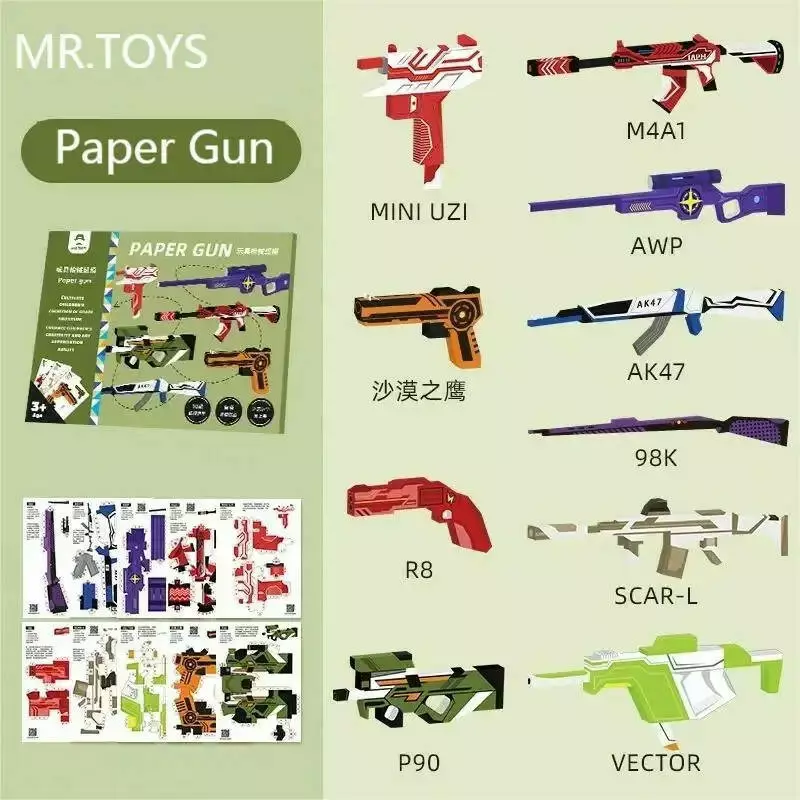 містить 36 аркушів для складання різних моделей паперової зброї. У